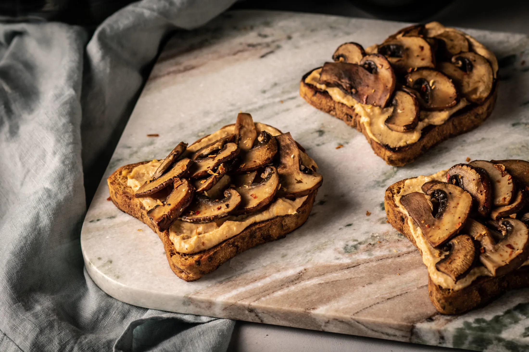 A hummuszt kevés chiliszósszal alaposan összekeverjük, és megkenjük vele a kenyérszeleteket. A gombát a hummusz tetejére halmozzuk, és chilipehellyel megszórva tálaljuk a pirítósainkat.