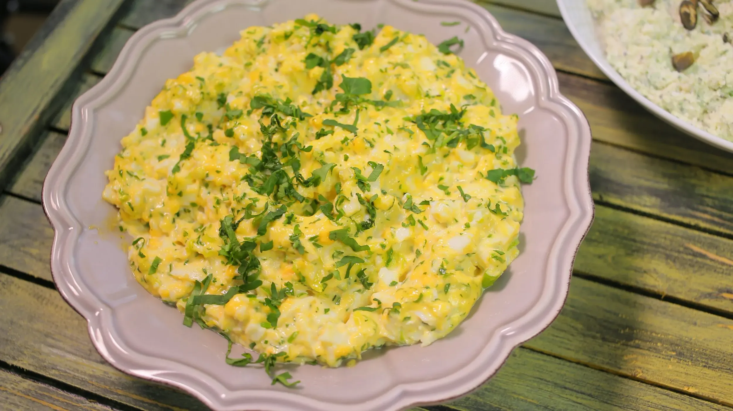Egy lábosban felteszünk vizet forrni és ráhelyezzük a bambuszpárolót. Amikor a víz már gőzölög, a párolóba rakjuk a tojásokat, lefedjük és kb. 10 percig gőzöljük. Eközben a szárzellert, az újhagymát valamint a petrezselymet finomra aprítjuk és egy tálba tesszük. Az időközben elkészült tojásokat, jeges vízben lehűtjük, megpucoljuk és a zöldségekhez adjuk. Reszelünk bele citromhéjat, teszünk bele egy nagy kanál majonézt és egy villa segítségével összetörjük. Adunk hozzá még egy kanál mustárt, citromlevet, fehérborsot, és egy kis majonézt, hogy kellőképp krémes legyen.