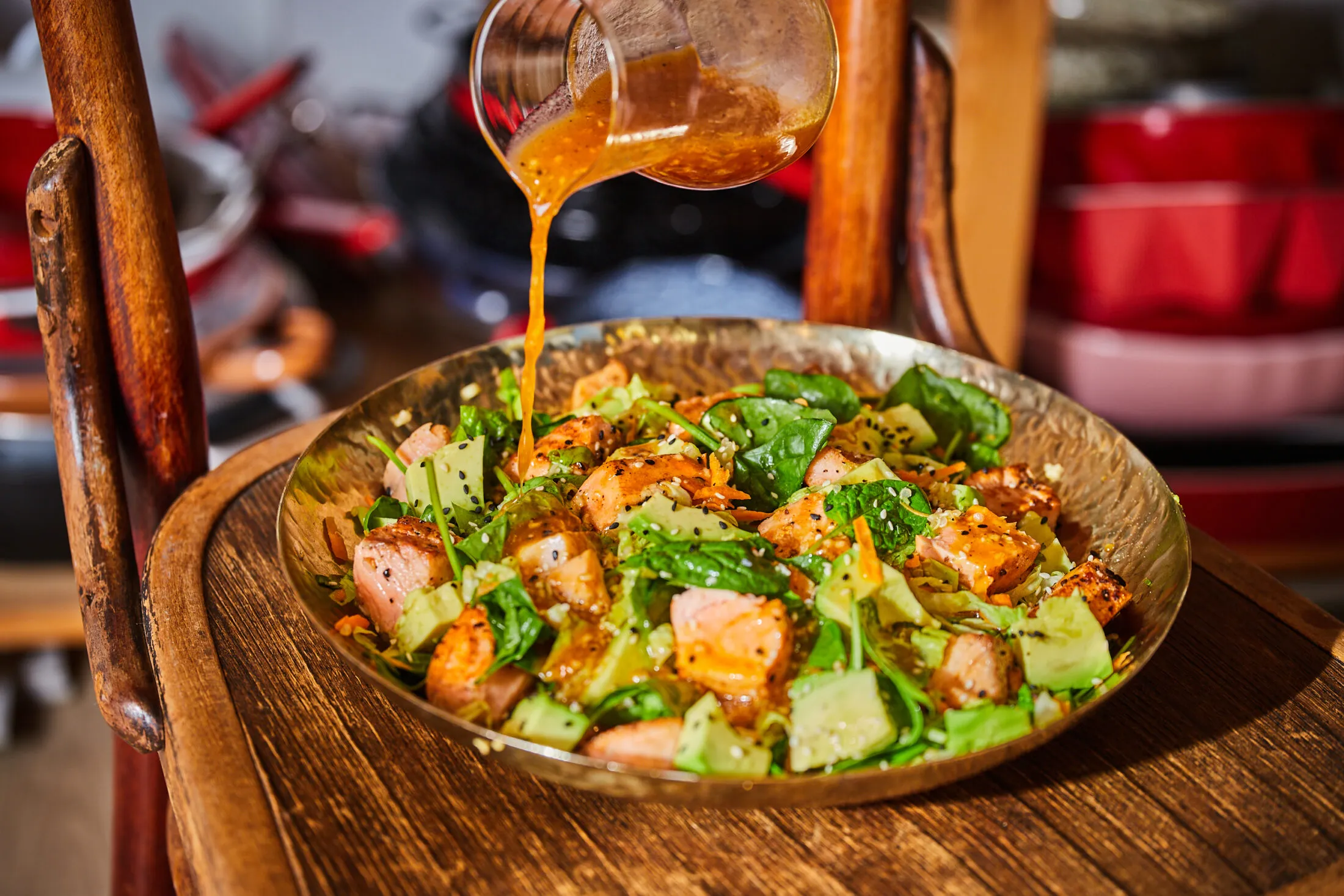 Az öntethez elkeverjük egy tálban a hozzávalókat a reszelt fokhagymával. A saláta tetejére pakoljuk a lazackockákat, meglocsoljuk az öntettel, és mehet a zaba.