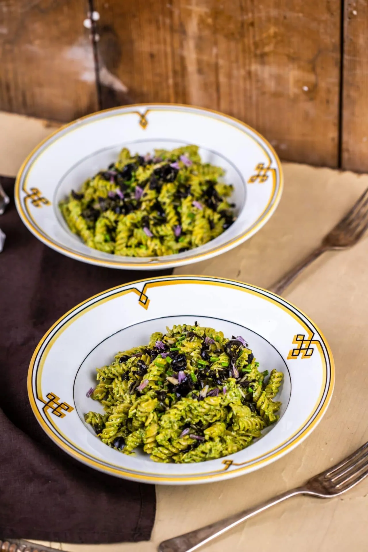 A fusillit forró, sós vízben al dentére főzzük, leszűrjük és összeforgatjuk a salátapesztóval. A fekete olajbogyót és a maradék tökmagot durvára vágjuk, ráreszeljük egy fél citrom héját és egy kevés finomra vágott zöld fűszerrel együtt az egészet összekeverjük. Ezt a gremolatát rászórjuk a tésztára, locsolunk rá még egy kis olívaolajat, meghintjük parmezánnal, és kész is vagyunk.