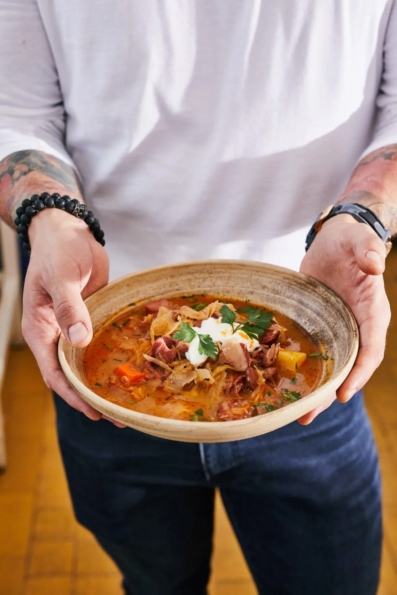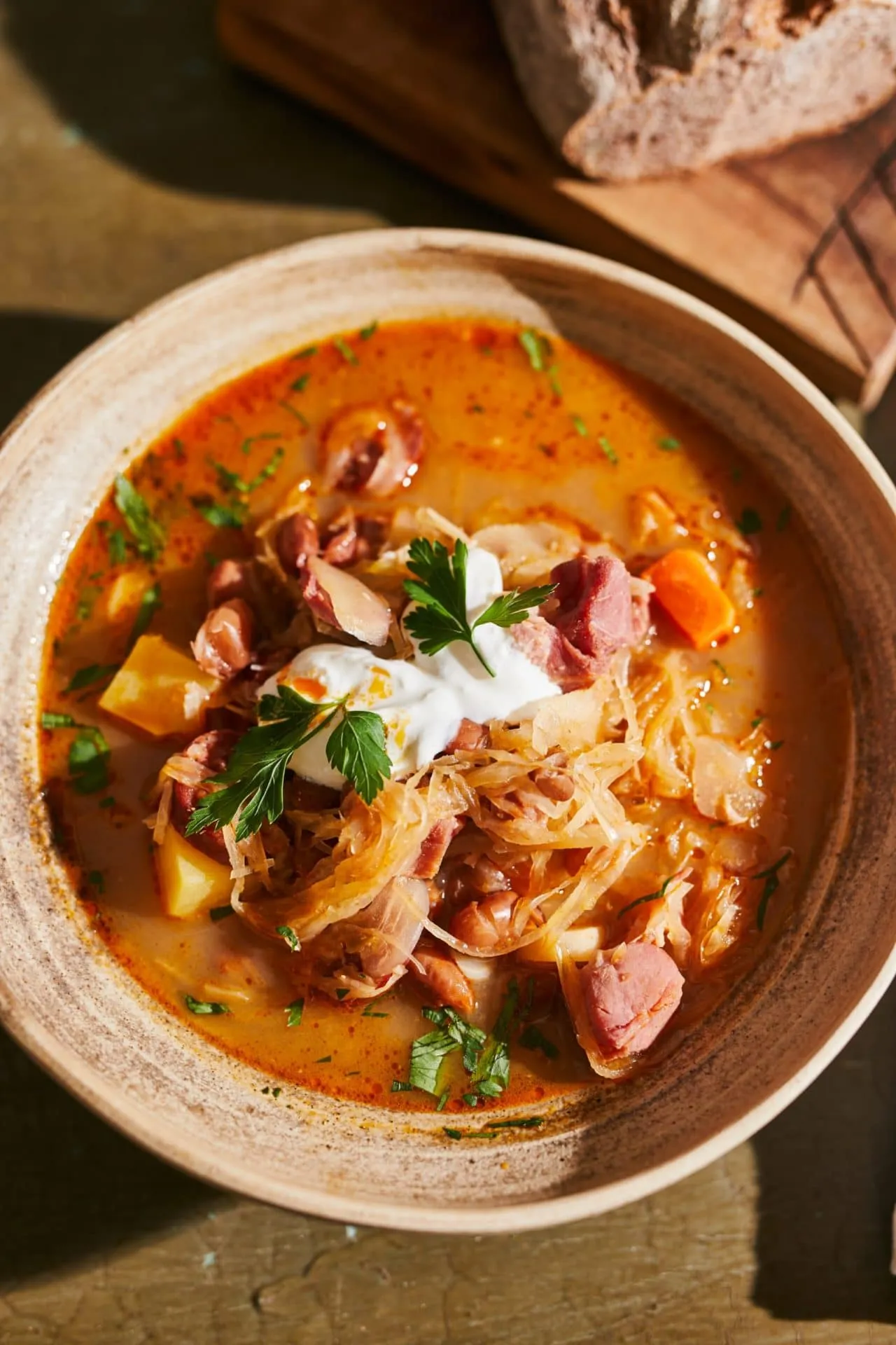 Az apróra vágott hagymát és fokhagymát lepirítjuk a zsíron. Hozzáadjuk a lisztet, pár percig pirítjuk, majd félrehúzzuk, megszórjuk a fűszerköménnyel és a füstölt paprikával, felöntjük kb. 300 ml vízzel, felforraljuk, majd leturmixoljuk. A kolbászt felszeleteljük, majd hozzádobjuk a káposztával (ha túl savanyúnak találjuk, mossuk át) együtt, és felengedjük annyi vízzel vagy alaplével, hogy ellepje. Addig főzzük, amíg a káposzta kb. háromnegyedig megfőtt, ezután hozzádobjuk a feldarabolt répát és fehérrépát, majd ezt is addig főzzük, amíg háromnegyedig megfőttek, ekkor hozzáadhatjuk a burgonyát. Ha mindent jól csináltunk, egyszerre lesznek kész a zöldségek.