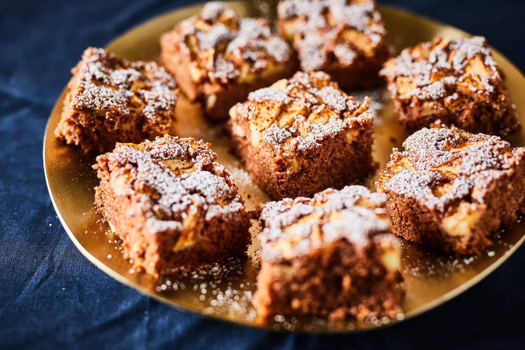 A masszát az enyhén kivajazott tepsibe simítjuk, rászórjuk az almakockákat, és 180 fokra előmelegített sütőbe toljuk kb. 35 percre. Kihűtve, porcukorral megszórva tálaljuk.
