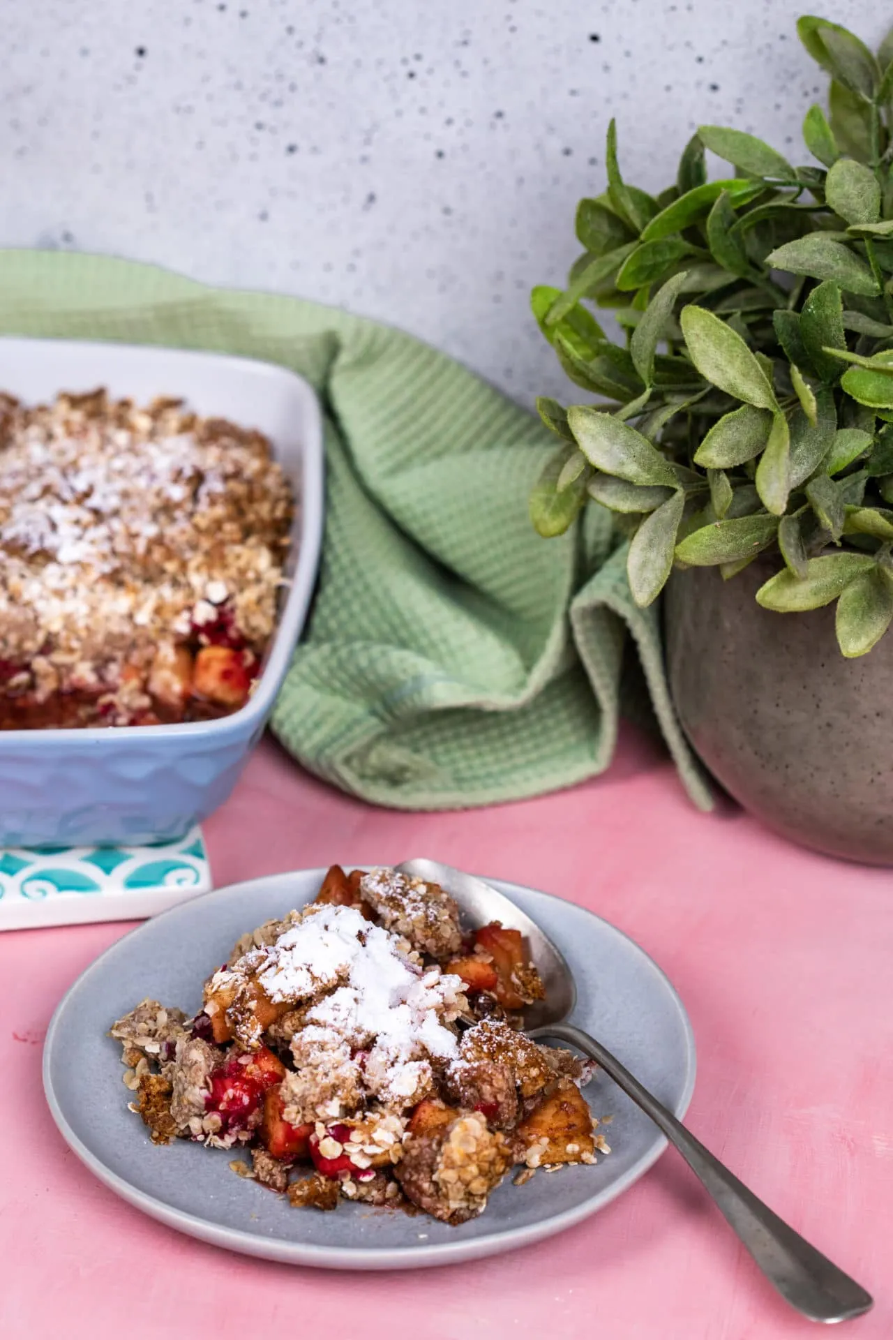 A morzsás (crumble) részhez a mandulát lezúzzuk, majd hozzáadjuk a fűszereket, a mézet, az olvasztott kókuszolajat, újra zúzunk egyet rajta, végül belekeverjük az apró szemű zabpelyhet is. Az almát a tepsi aljára rakjuk, hozzászórjuk a málnát, és beterítjük a zabpelyhes morzsával. Betoljuk a 180 fokra előmelegített sütőbe, és kb. 35 perc alatt készre sütjük, majd porcukorral tálaljuk.