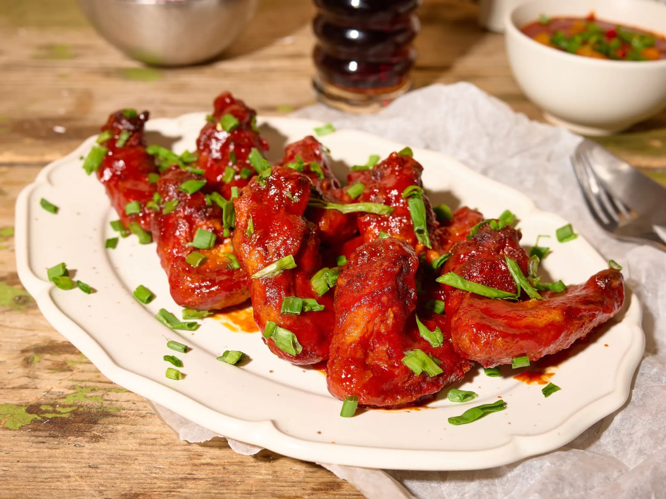 Amíg sülnek a szárnyak, egy tálban kikeverjük a páchoz az olvasztott vajat, a paradicsomszószt, a sriracha szószt és a mézet. A kész csirkeszárnyakat megmártjuk a pácban, és friss, aprított újhagymával megszórva tálaljuk.