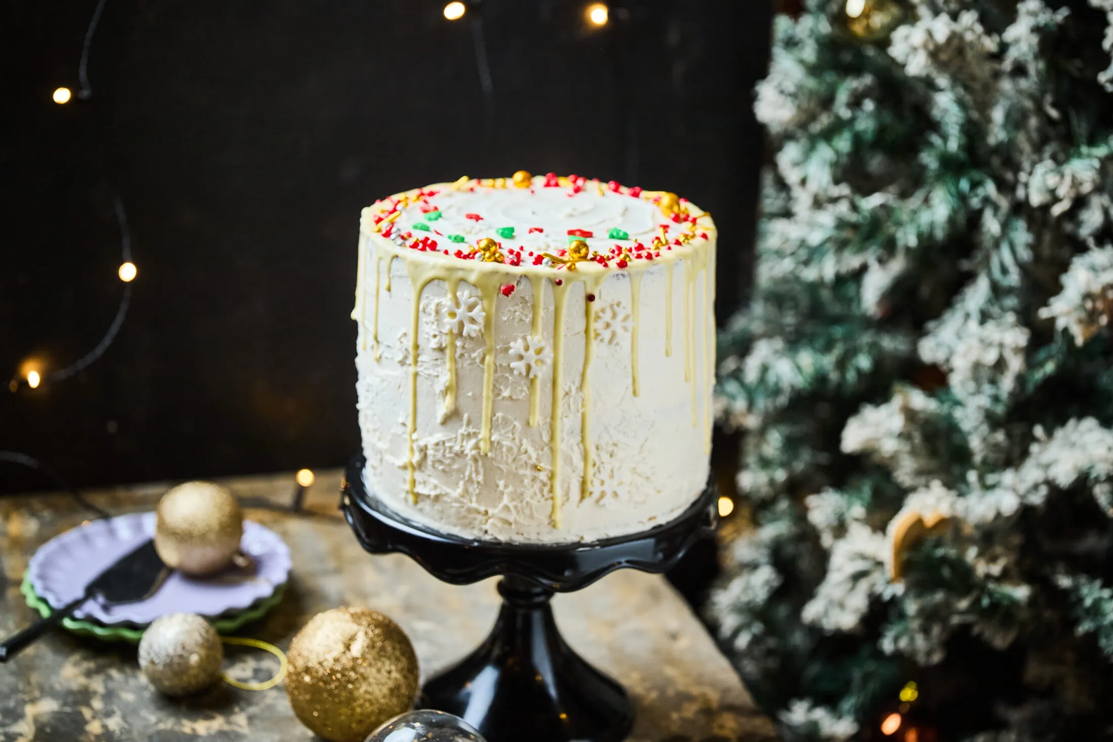Végül lekenjük a tortát a vajkrémmel, a dekoráláshoz használhatunk csillagcsövet, majd olvasztott fehér csokit csorgatunk rá és megszórjuk dekorcukorral.
