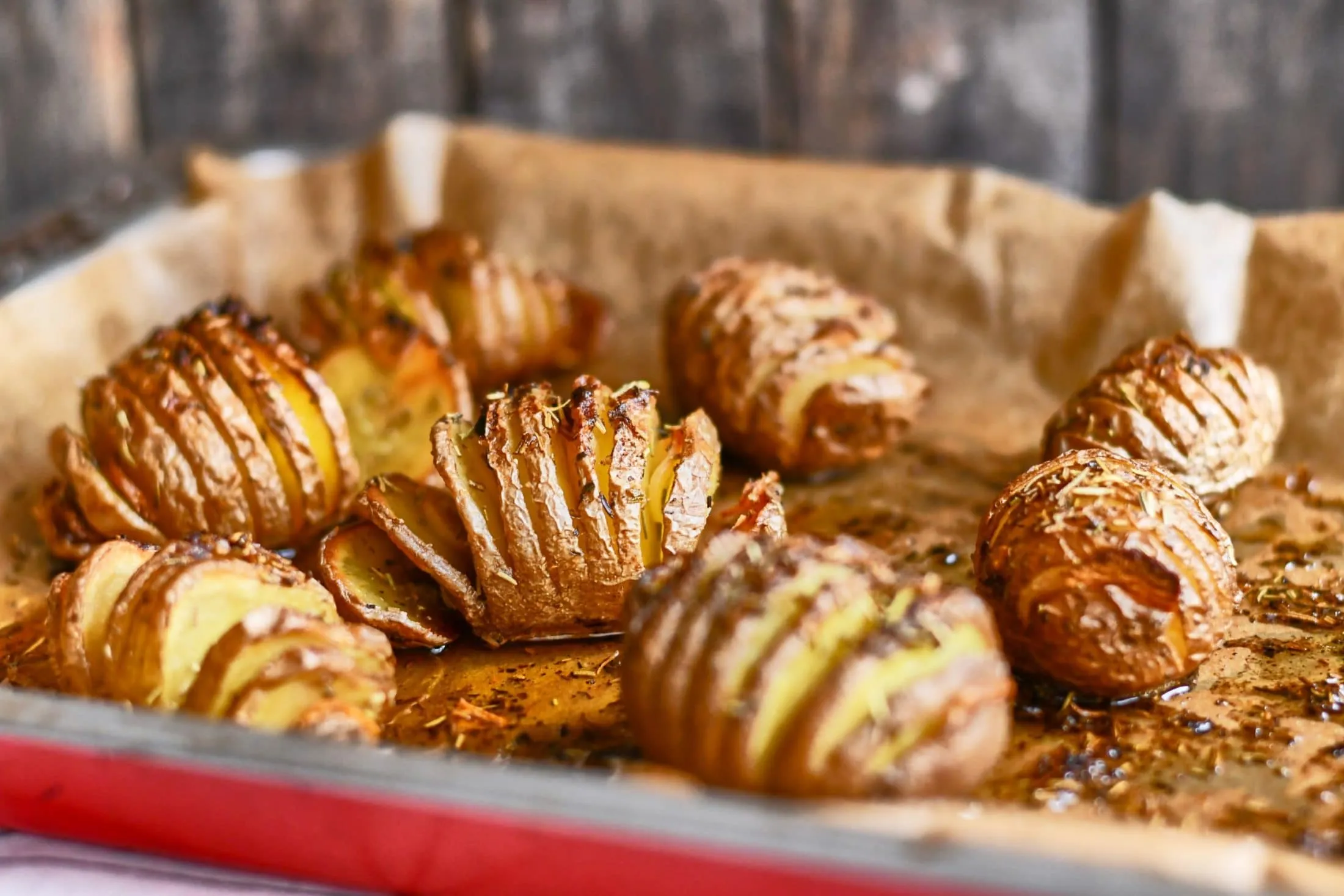 A burgonyákat megmossuk, és bevagdossuk őket. A szeletek közé vékony, lapokra szeletelt fokhagymát dugdosunk. A fűszereket összekeverjük, óvatosan beledörzsöljük a burgonyákba, és meg is szórjuk őket vele. Meglocsoljuk az olívaolajjal, darabokra vágott vajat rakunk a tetejükre, és mehetnek is a 190 fokra előmelegített sütőbe, kb. 40 percre, amíg szépen megpuhulnak és a külsejük ropogósra sül.