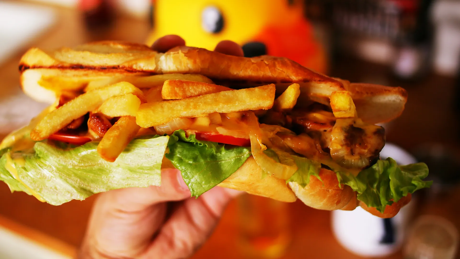 Megfordítjuk a hús darabokat és mellé teszünk a karikákra vágott hagymát. majd ismét visszatesszük 10 percre sülni. A szendvics összeállításához a baguettet félbe vágjuk és egy kis vajon lepirítjuk. Megkenjük mindkét oldalát mustárral, teszünk rá egy kis saláta levelet, pár karika paradicsomot és a feldarabolt húst. Végül meglocsoljuk sajtszósszal és egy marék sültkrumplit teszünk a tetejére.