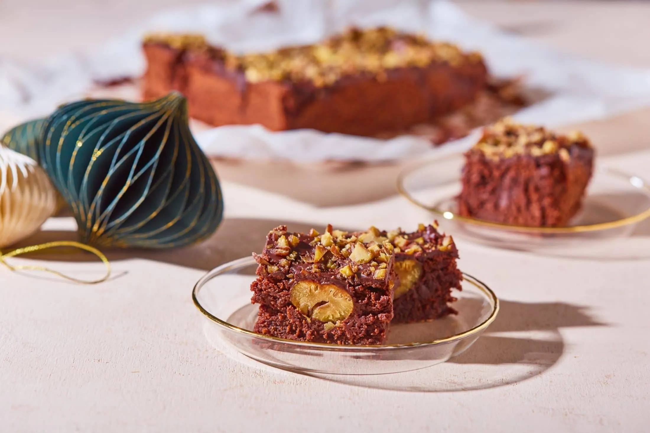 Sütőpapírral bélelt tepsibe simítjuk a tésztát, és az egész sült gesztenyéből 6-8 szemet belenyomunk. 160 fokra előmelegített sütőbe tesszük 40 percre, majd kivesszük, és legalább szoba-hőmérsékletűre hagyjuk hűlni, hogy megvágáskor ne morzsálódjon nagyon.