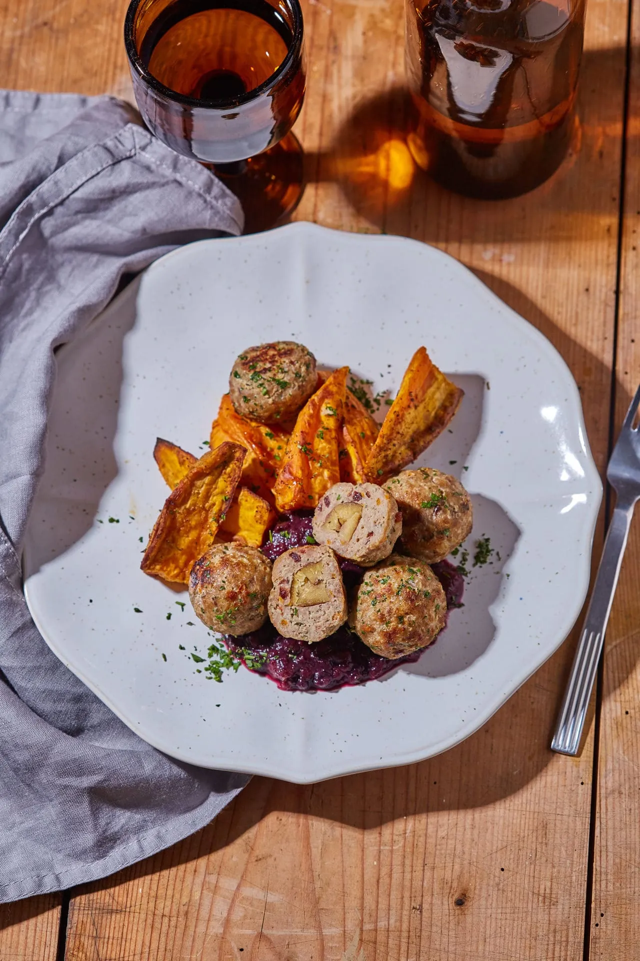 A húsgolyóhoz a hagymát, a répát, a zellert és a vörös áfonyát apróra vágjuk, és egy serpenyőben üvegesre pirítjuk, majd félretesszük lehűlni. Összekeverjük a többi hozzávalóval, és diónyi nagyságú gombócokat formázunk belőle úgy, hogy a közepükbe egy-egy gesztenyét is teszünk. A gombócokat egy sütőpapírral bélelt tepsire tesszük, és az édesburgonya mellé toljuk a 180 fokra előmelegített sütőbe, és kb. 20-25 perc alatt készre sütjük.