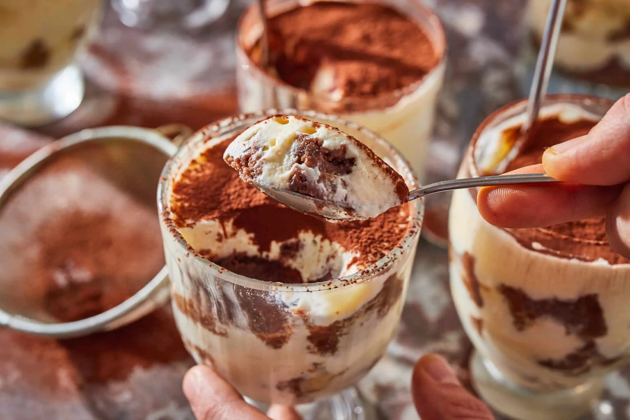 A kihűlt piskótát 6 cm-es csíkokra daraboljuk, majd jöhet az összeállítás. A piskótákat megmártjuk a kávéban, a poharak aljára rakunk kb. négy-négy darabot, majd jöhet rájuk egy adag krém, majd megint piskóta, és megint krém. Ezt addig ismételjük, amíg el nem fogynak. Az utolsó réteg krém legyen, amit megszórunk kakaóporral. Végül hűtőbe dobjuk a poharakat, hogy összeálljon a tiramisu.
