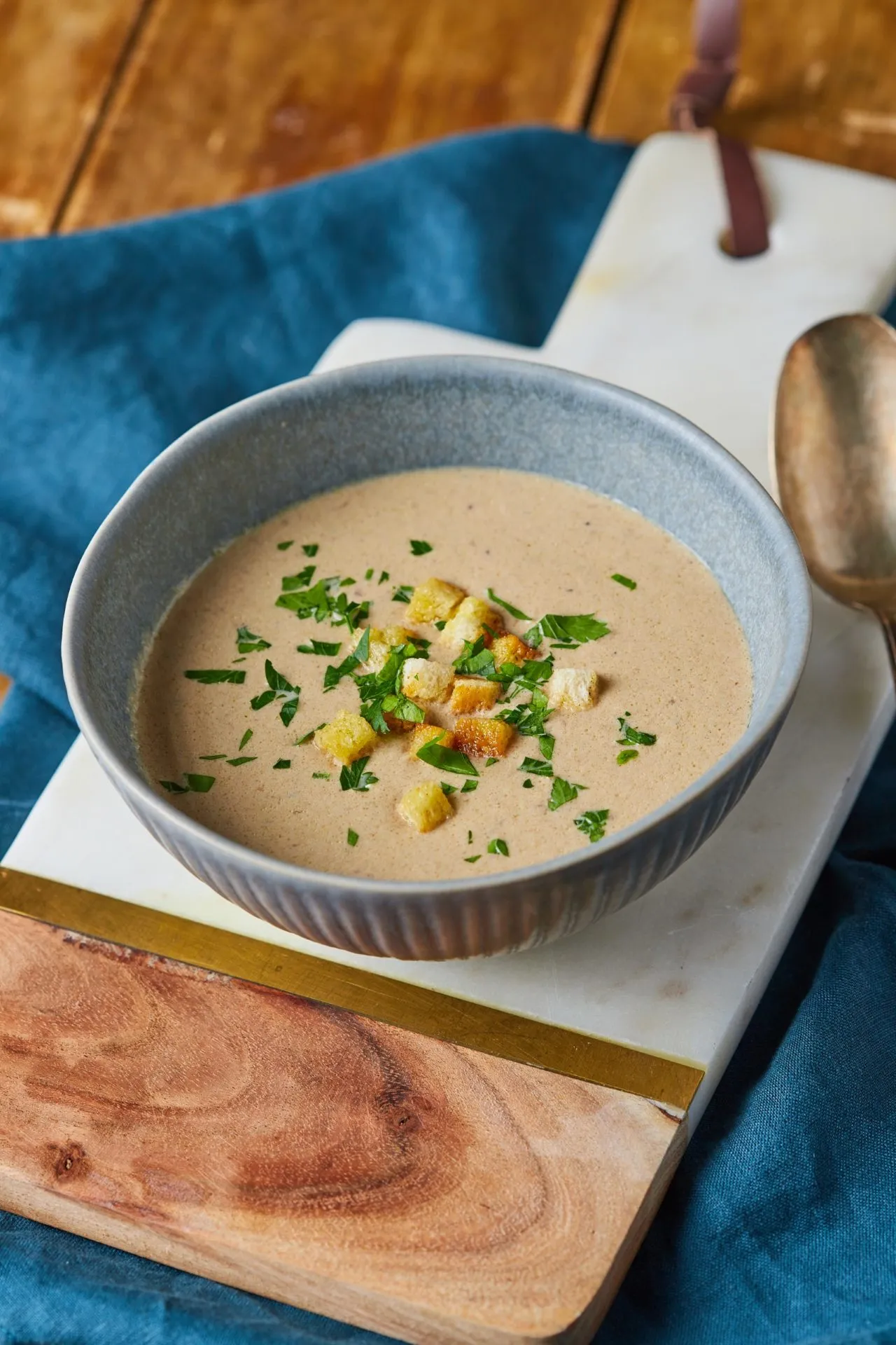 Amikor lepirítottuk a gombát is, felöntjük az alaplével, sózzuk, és 8-10 percig főzzük. Amikor megfőtt, lehúzzuk a levest a tűzhelyről, és egy botmixer segítségével alaposan összeturmixoljuk. Visszatesszük a tűzre, és hozzáadjuk a tejszínt. Amikor újra felforrt a leves, belemorzsoljuk a kéksajtot és hozzáadjuk a vajat, majd elzárjuk alatta a tűzhelyet.