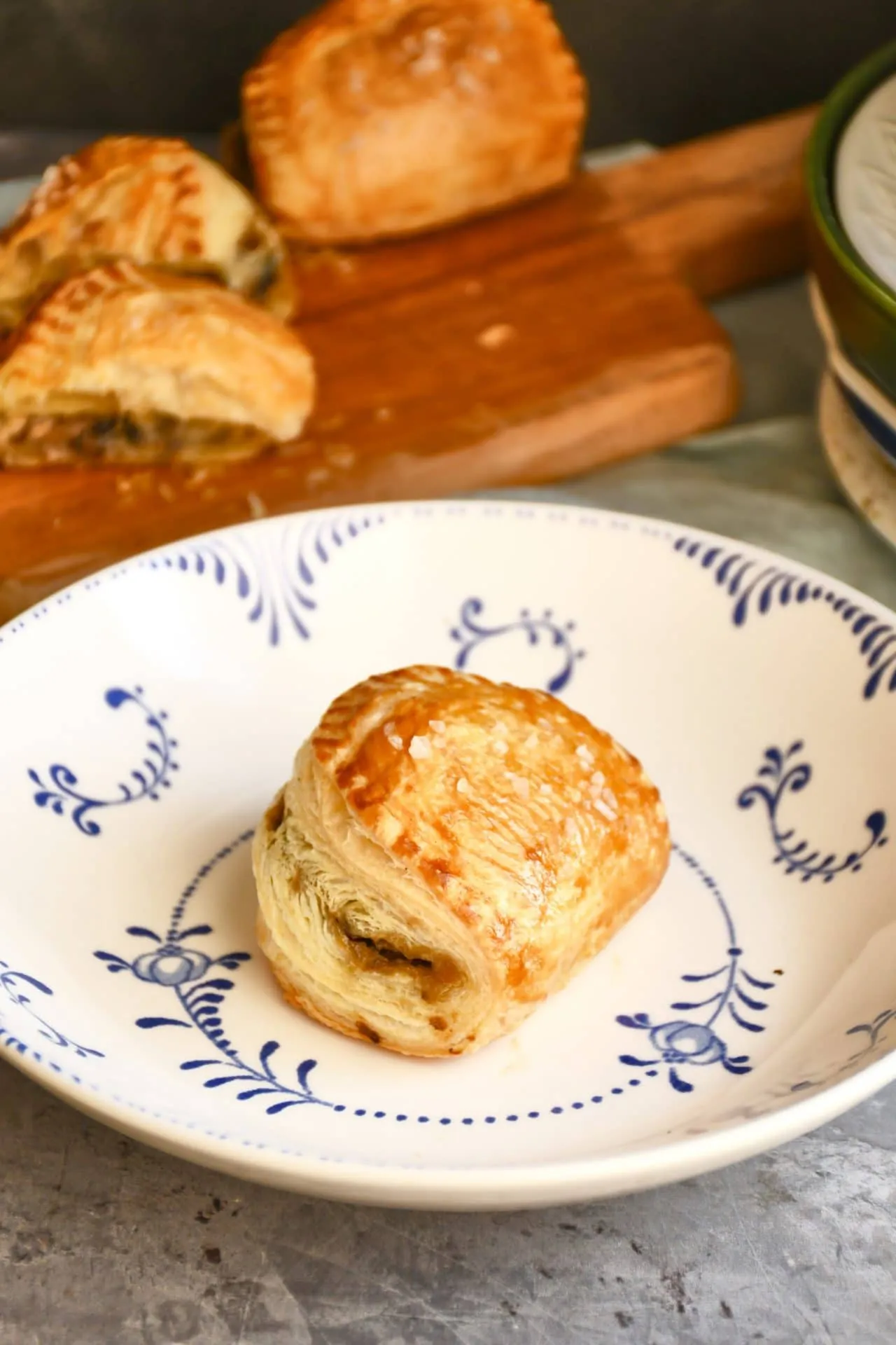 A leveles tésztát kihajtogatjuk, és 6 db hosszabb téglalapformát vágunk belőle. A tésztaszéleket lekenjük tojással, egyik felükre rakunk egy nagy kanál tejfölös gombát, majd ráhajtjuk a tészta másik felét. Lenyomkodjuk a széleket egy villával (egy ollóval formára igazíthatjuk előtte, hogy kicsit kerekebb legyen), lekenjük tojással, esetleg megszórjuk nagy szemű sóval, és már mehet is a 180 fokra előmelegített sütőbe, kb. 20 percre, amíg aranybarna színt kap.