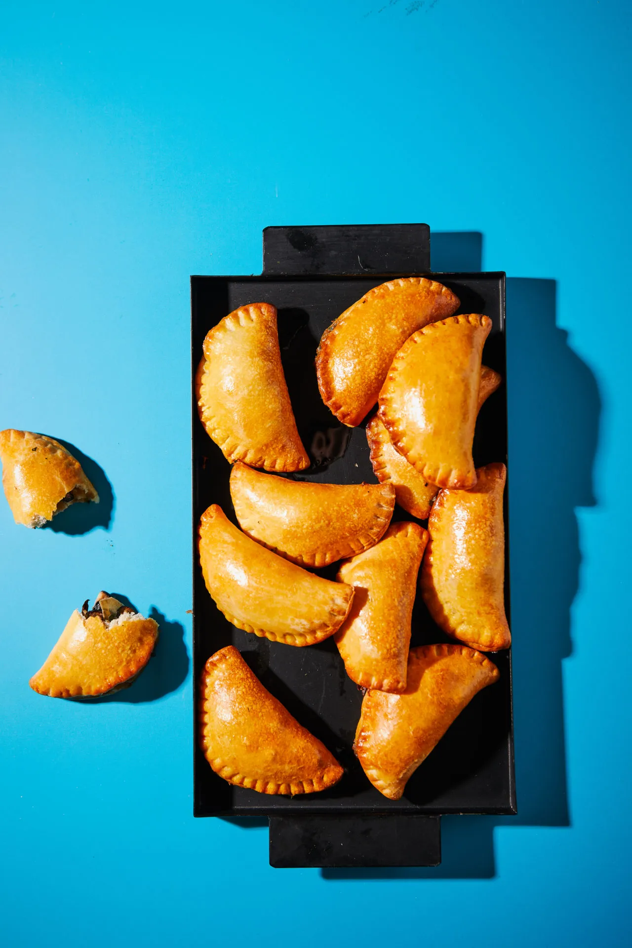 A tésztát lisztezett felületen kicsit kinyújtjuk, majd egy pohár vagy pogácsaszaggató segítségével körülbelül 5 centis köröket vágunk belőle. Az ujjunkat belemártjuk egy kevés vízbe, és a körök felének az egyik szélét megnedvesítjük. Ez azért fontos, hogy félbehajtásnál összetapadjon a tészta. Egy teáskanálnyi tejszínes gombát teszünk a tészta megnedvesített oldalába, és ráhajtjuk a másik felét – szép félhold alakot kell kapnunk. Egy villával összenyomkodjuk a tészta széleit, majd lekenjük felvert tojással, és 200 fokra előmelegített sütőben körülbelül 10 perc alatt aranybarnára sütjük. Kivesszük a sütőből, hagyjuk egy kicsit hűlni, és már ehetjük is.