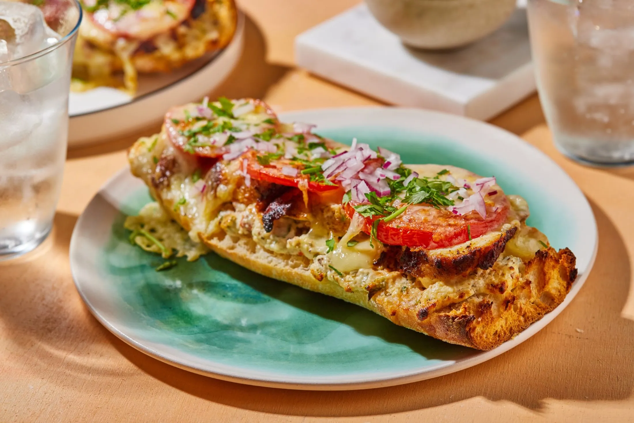 A bagettet félbevágjuk, megkenjük a fetás krémmel, ráhelyezzük a felszeletelt csirkemellet. Mehet rá a karikára vágott paradicsom és a reszelt sajt, majd 220 fokos sütőben, grill fokozaton 6-8 percig sütjük, amíg a sajt meg nem pirul a tetején.