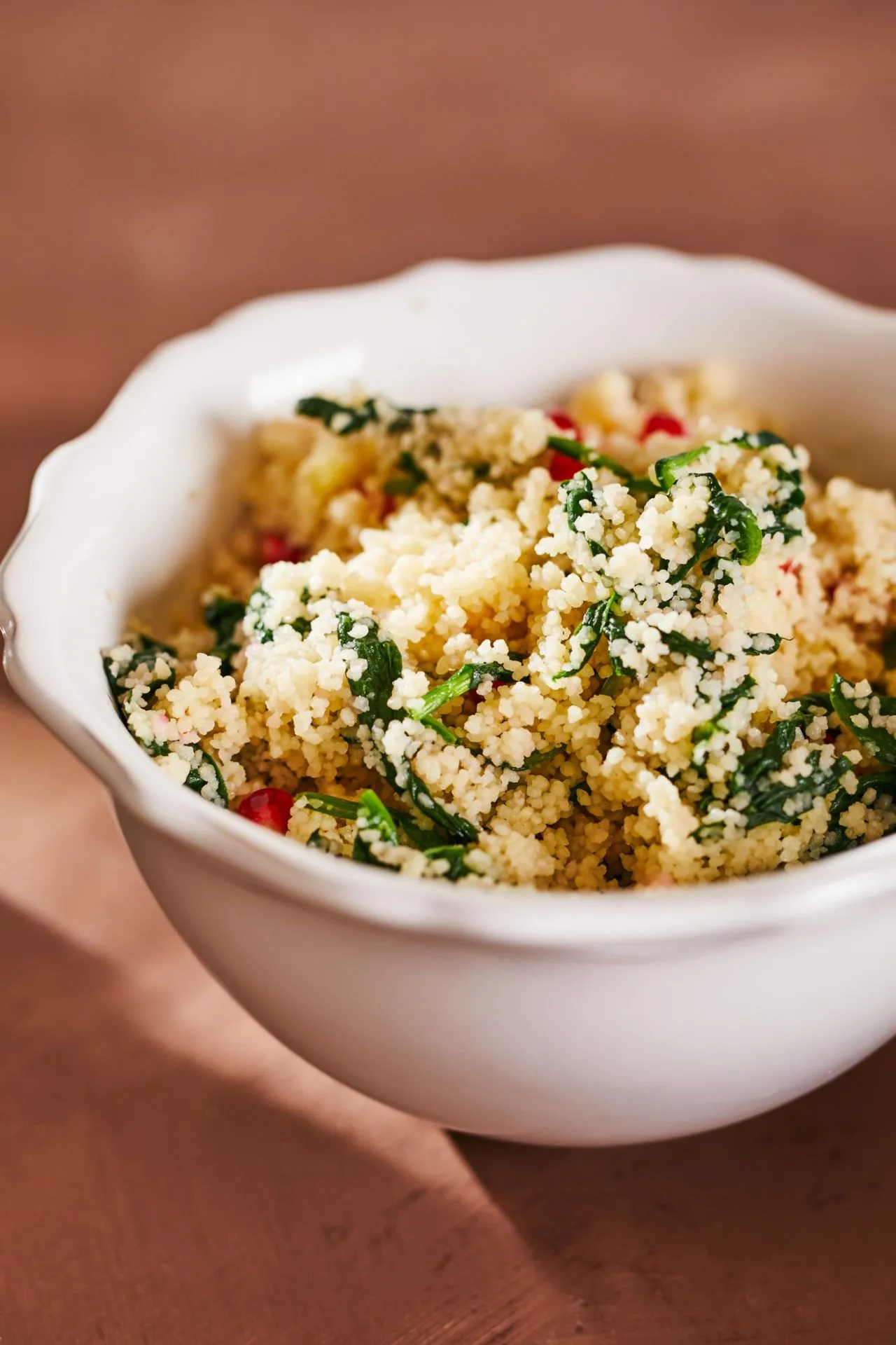 A kuszkuszhoz egy serpenyőben megpirítjuk az apróra vágott fokhagymát az olajon, rádobjuk a spenótot, egy csipet sót, és ha összeesett, elzárjuk. A vizet felforraljuk, a kuszkuszt egy tálban összekeverjük a spenóttal, és felöntjük a vízzel. Lefedjük, és 5 percet állni hagyjuk. A gránátalma magjait kiütögetjük, a kuszkuszba keverjük, és a csirkét ezzel a körettel tálaljuk.