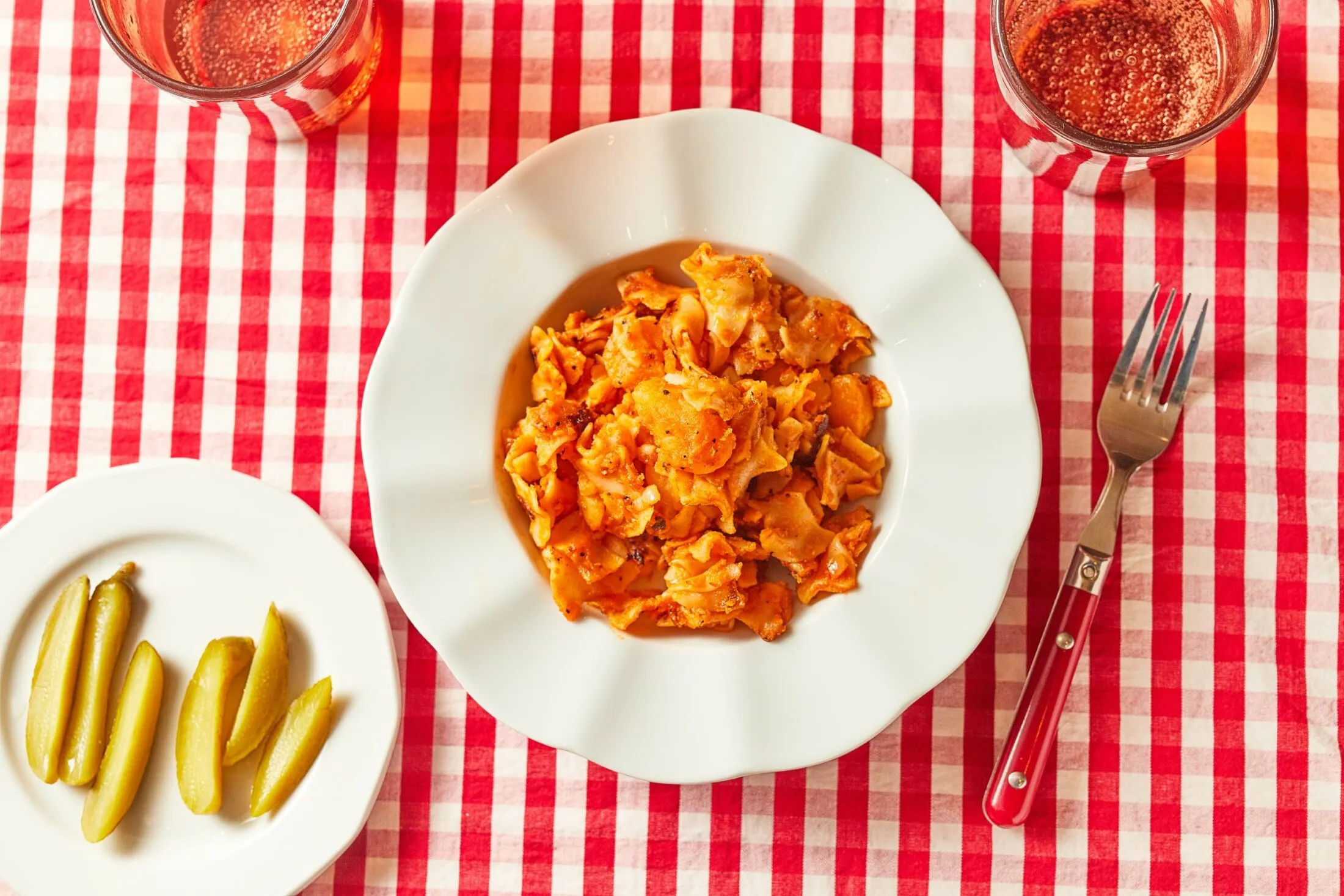 Zsírt melegítünk egy lapos, inkább szélesebb lábasban vagy nagyobb serpenyőben, és közepes hőfokon kb. 8 perc alatt megdinszteljük benne a finomra vágott vöröshagymát. Megszórjuk a fűszerpaprikával, hozzáadjuk a krumplit és erős hőfokon elkezdjük pirítani, miközben egy krumplinyomó segítségével darabosra törjük. Hozzáadjuk a tésztát, felöntjük a főzővízzel, sózzuk, borsozzuk – ez utóbbit ne sajnáljuk –, és erős hőfokon kb. 5 perc alatt lepirítjuk, majd tálalunk.
