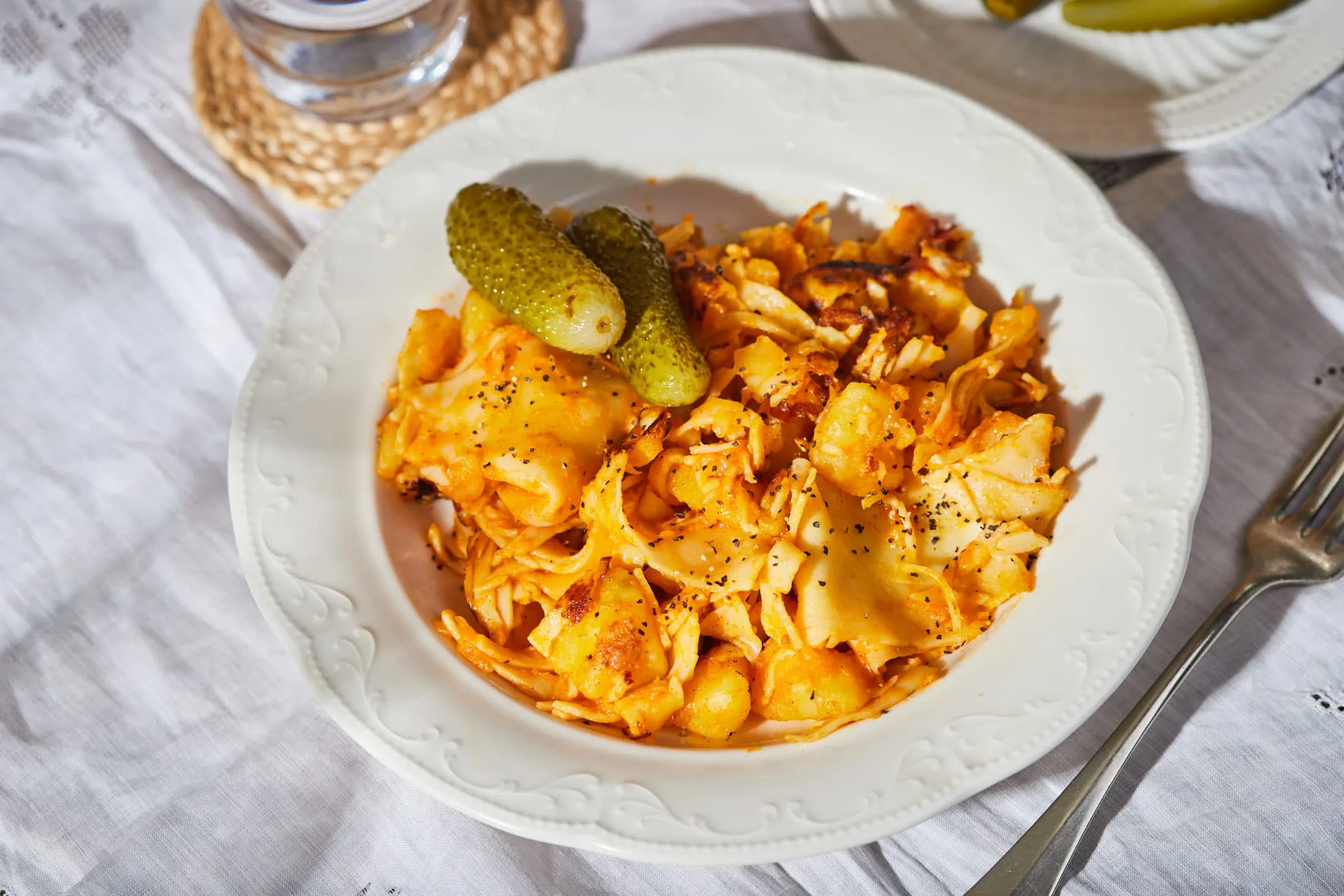 Egy serpenyőben közepes lángon felolvasztjuk a zsírt, megdinszteljük rajta az apró kockákra vágott hagymát. Ha megpirult, lehúzzuk a tűzről, és megszórjuk a pirospaprikával. Visszatesszük a főzőlapra, hozzáadjuk a megfőtt krumplit, amit egy villával darabosra törünk. Beletesszük a tésztát, felöntjük a főzővízzel és sózzuk, borsozzuk. Ne sajnáljuk a borsot! Végül ízesítjük a köménnyel, és magas lángon alaposan lepirítjuk, majd savanyúsággal tálaljuk.