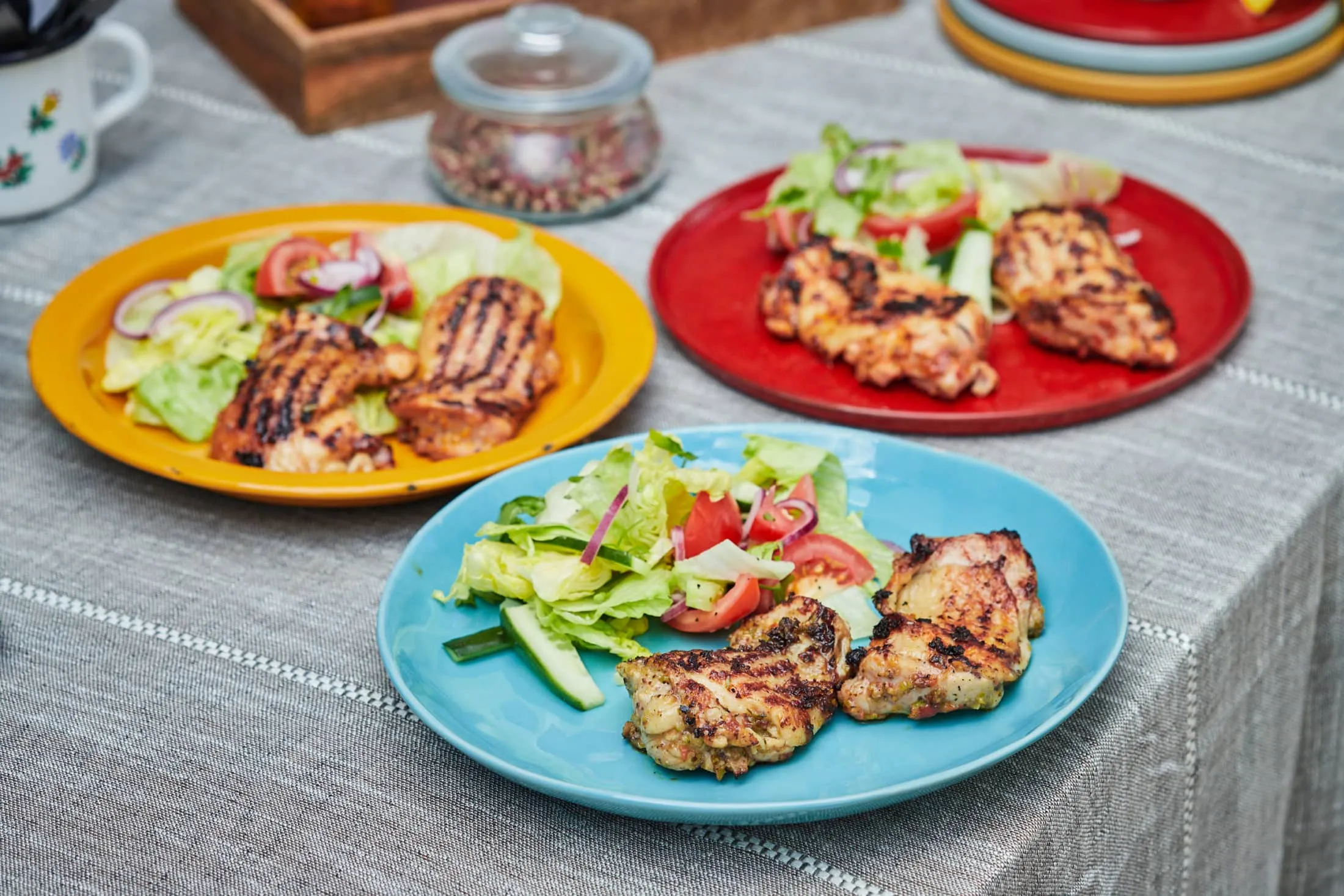 A bepácolt csirkecombokat közepesen forró grillben megsütjük oldalanként 5-6 perc alatt a bőrös oldalán kezdve, majd a salátával tálaljuk.