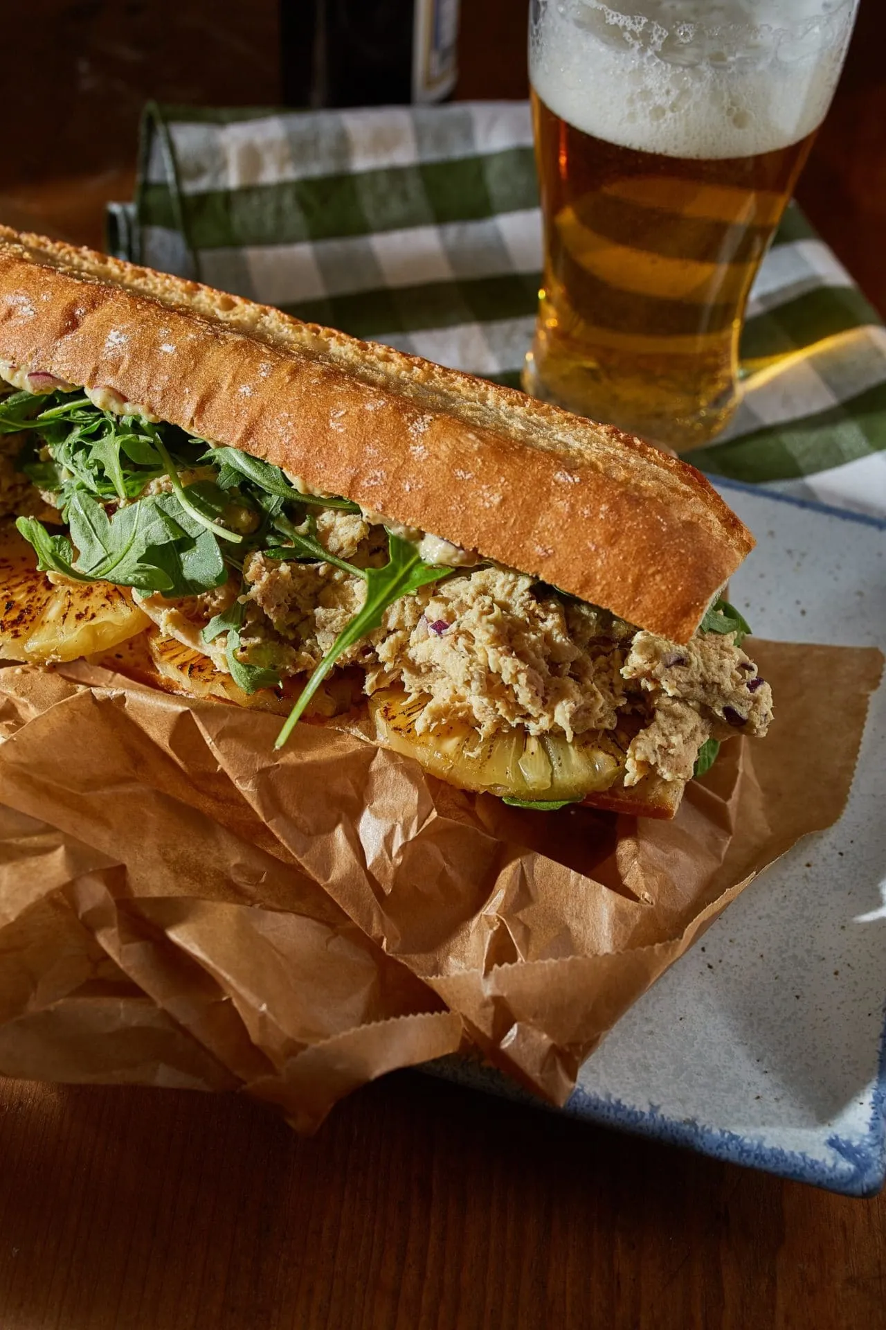 A bagettet félbevágjuk, megkenjük az alját és tetejét a maradék mártással, beletesszük a 4 ananászt, a csirkehúst és a rukkolát, és kész is.