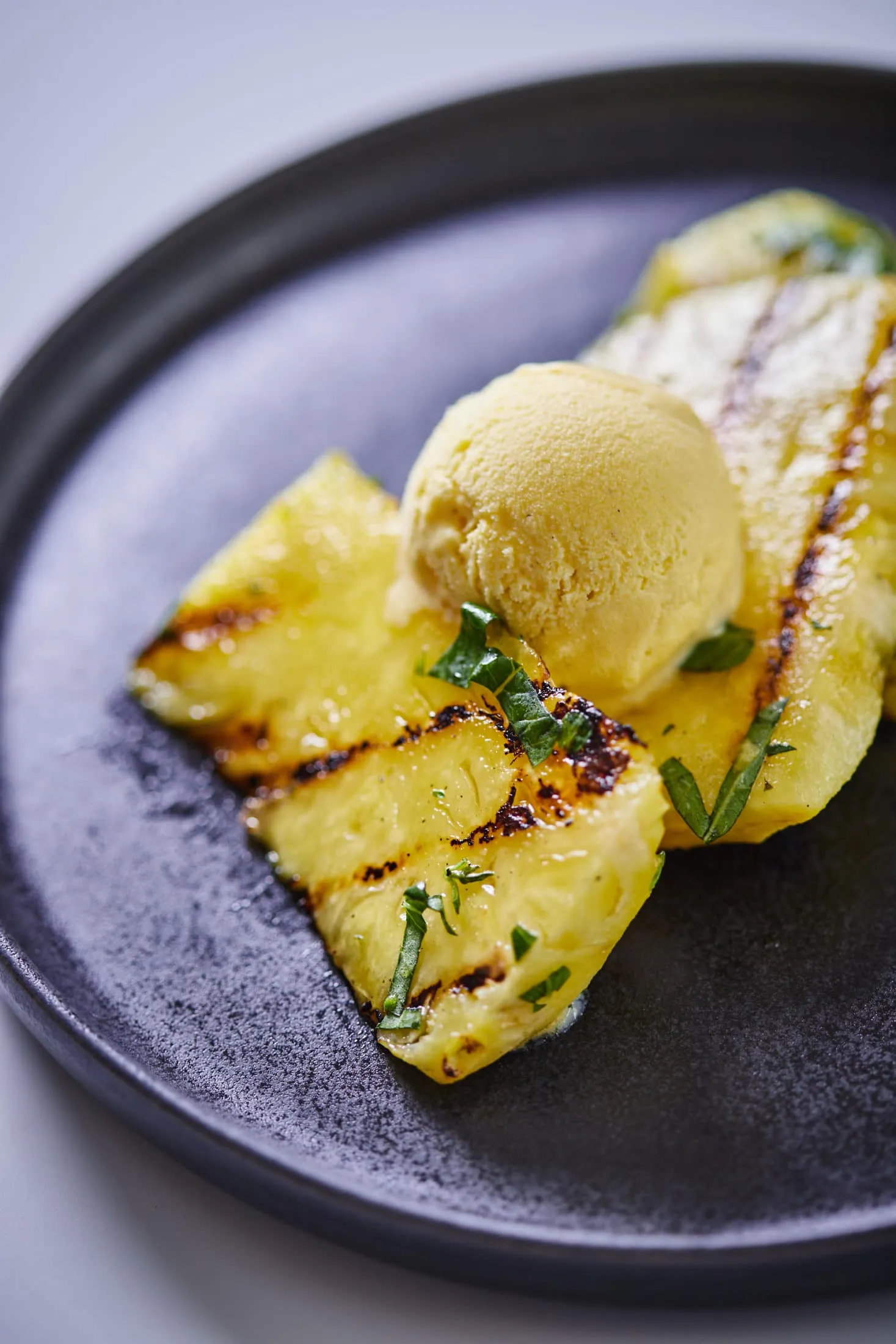 A frissen sült ananászt egy tálba szedjük, meglocsoljuk a juharsziruppal, megszórjuk az aprított bazsalikommal, lefedjük, és hagyjuk állni 5 percet. A langyos ananászt a fagyival tálaljuk.