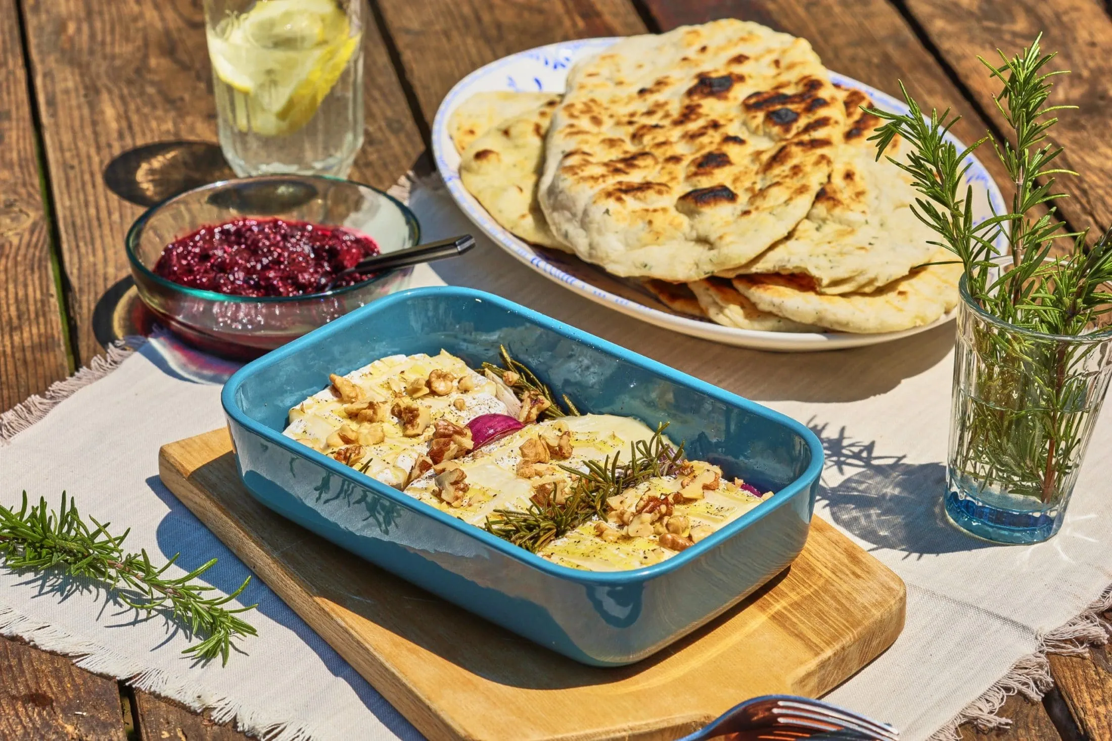 Ha minden készen van, a lepénykenyereket a grillezett, diós sajttal és a gyümölcsraguval tálaljuk.
