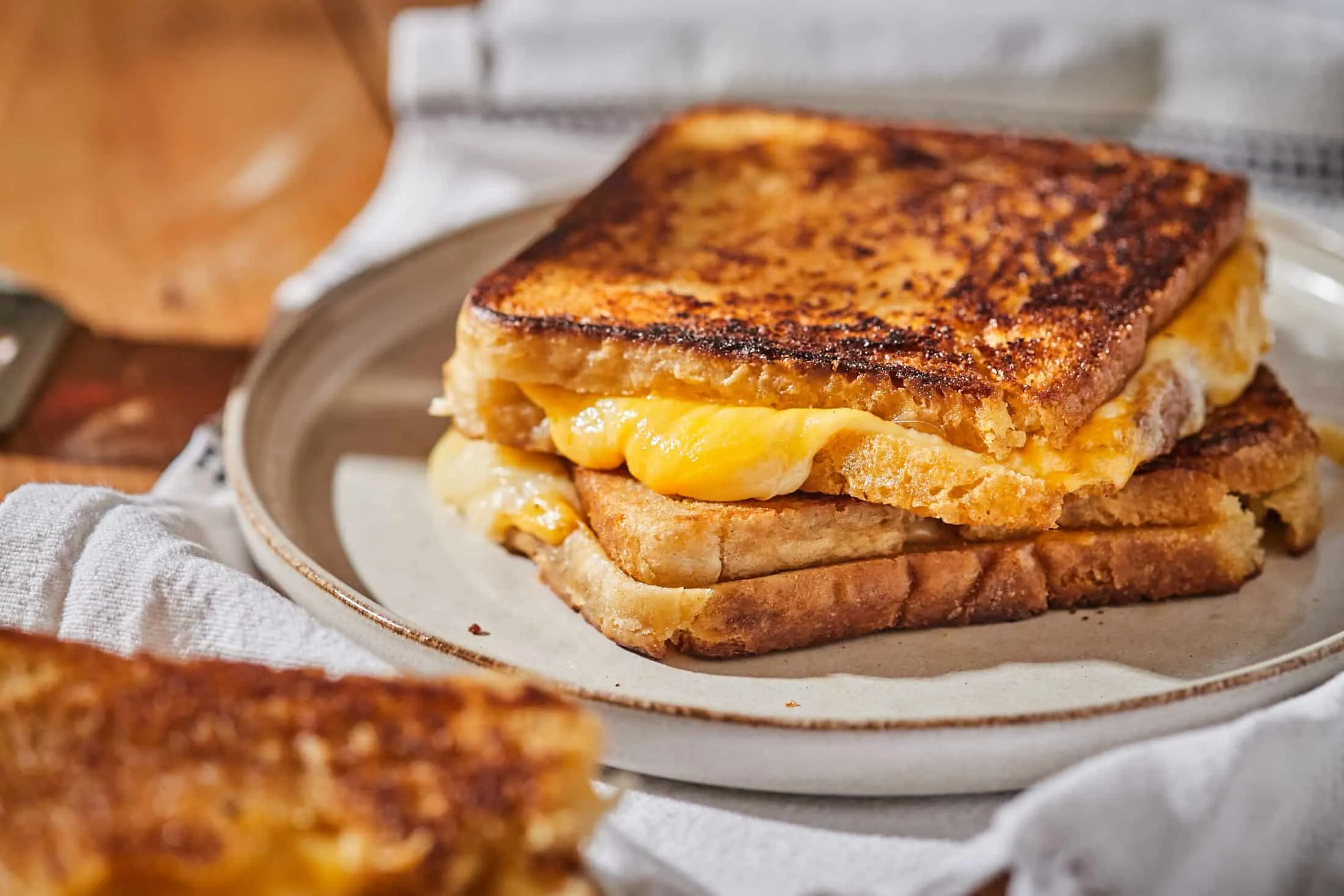 A grillezett sajtos szendvicshez egy serpenyőben kevés olívaolajat hevítünk közepes lángon. Két szelet toastkenyér egy-egy oldalát megkenjük vajjal, majd ezzel a felével lefelé a serpenyőbe helyezzük a kenyereket.