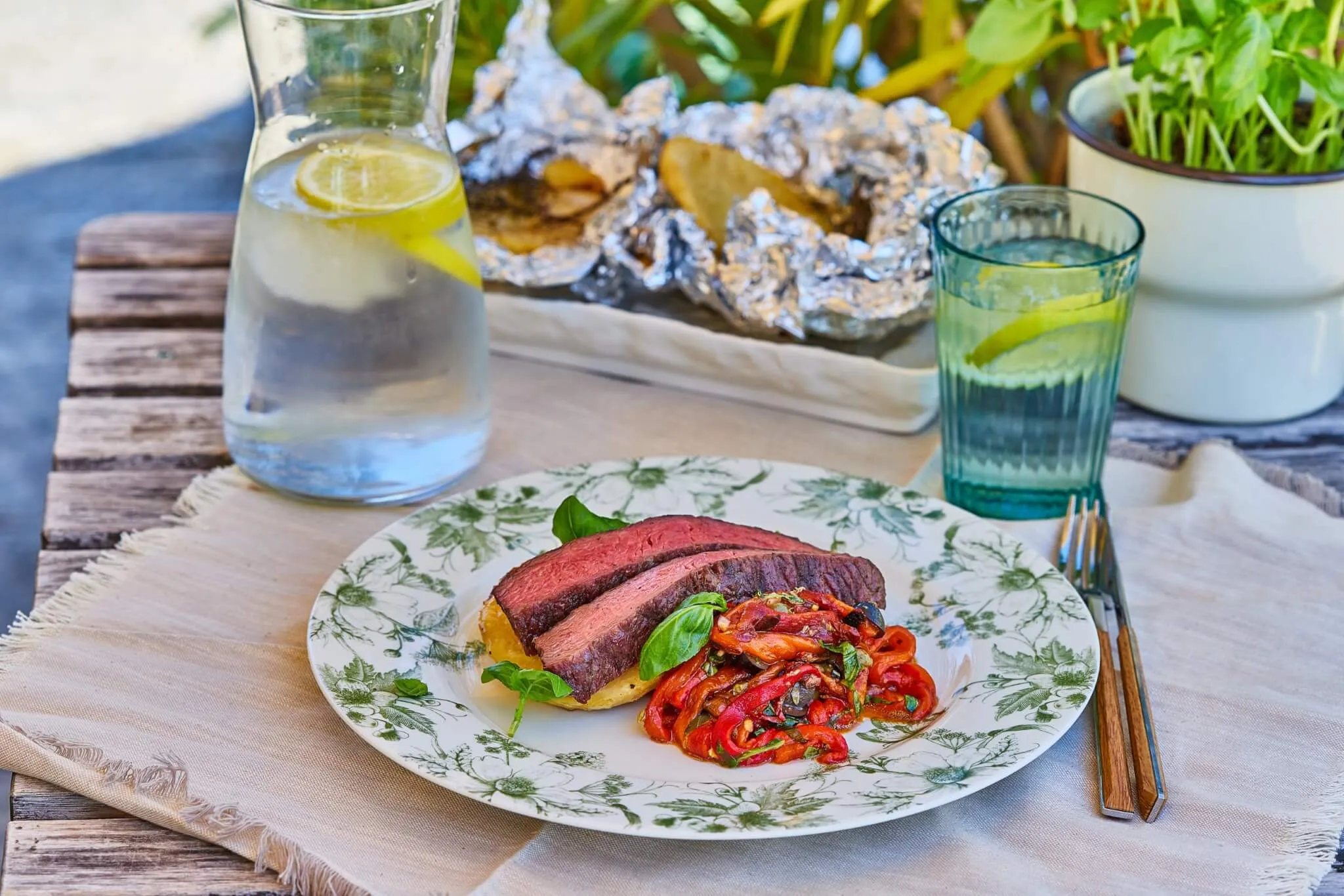 A grillezett steak előtt a salátával foglalkozunk. A kápia paprikákat a grillre dobjuk, és hagyjuk, hogy feketére égjen a héja, majd egy tálba tesszük, és lefedve hagyjuk 5-10 percre.