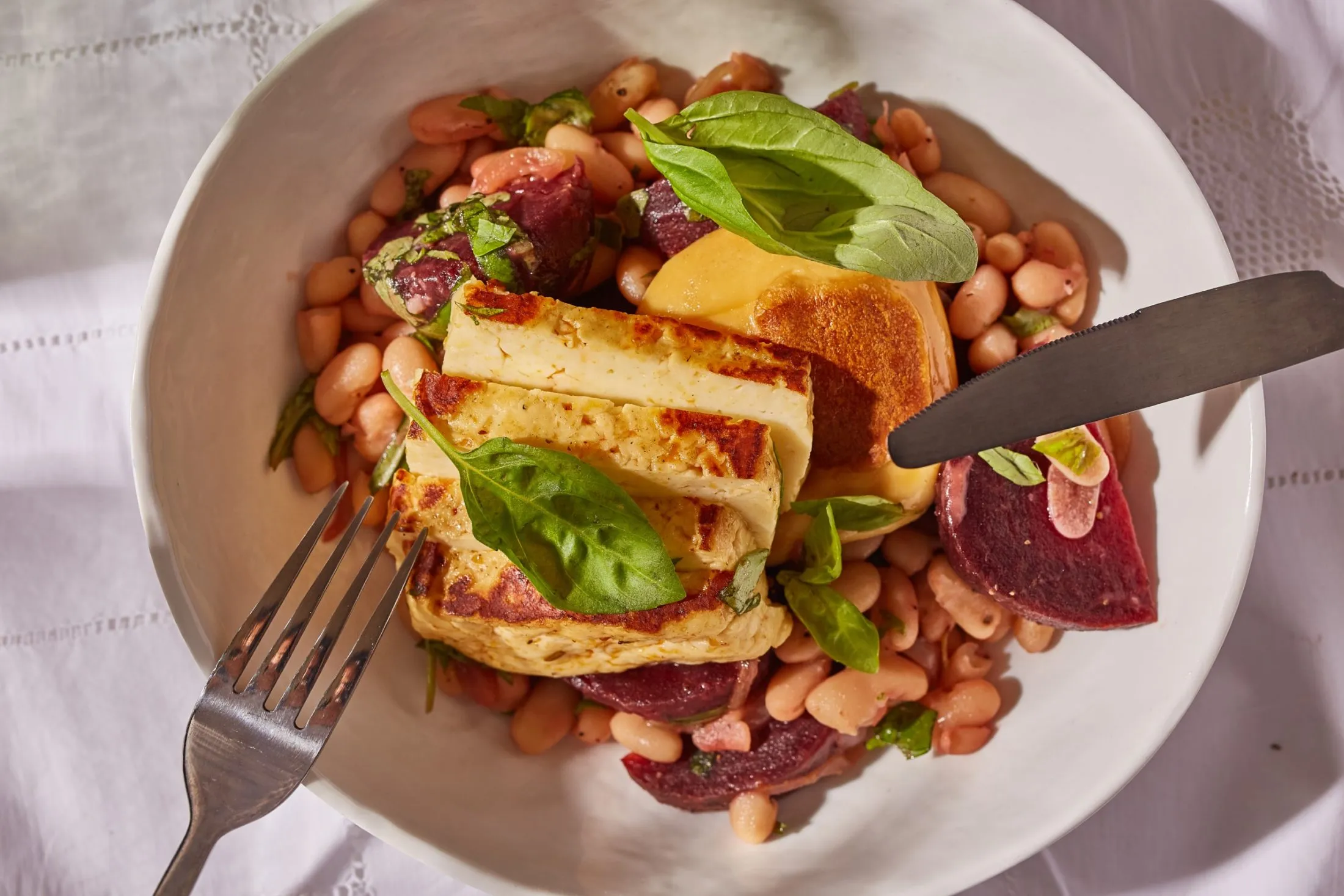 A grillsajt bazsalikomos pirított cannellinivel elkészítéséhez a félfőre vágott hagymát és a szeletelt fokhagymát 3 ek olívaolajon 4-5 perc alatt átpirítjuk, majd hozzádobjuk az átmosott, leszűrt babot, és ezzel is 2-4 percig pirítjuk, majd jöhet a cikkekre vágott cékla és a csíkozott bazsalikom. Sózzuk, borsozzuk, végül átforgatjuk, majd a grillsajttal tálaljuk, és díszíthetjük néhány bazsalikomlevéllel is.