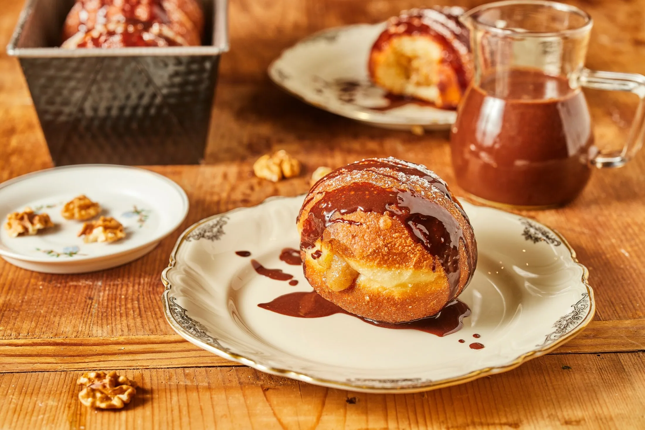 Végül belenyomjuk a Gundel-fánkok közepébe a diótölteléket, tányérra tesszük, megszórjuk porcukorral és jól nyakon öntjük a meleg csokiöntettel.