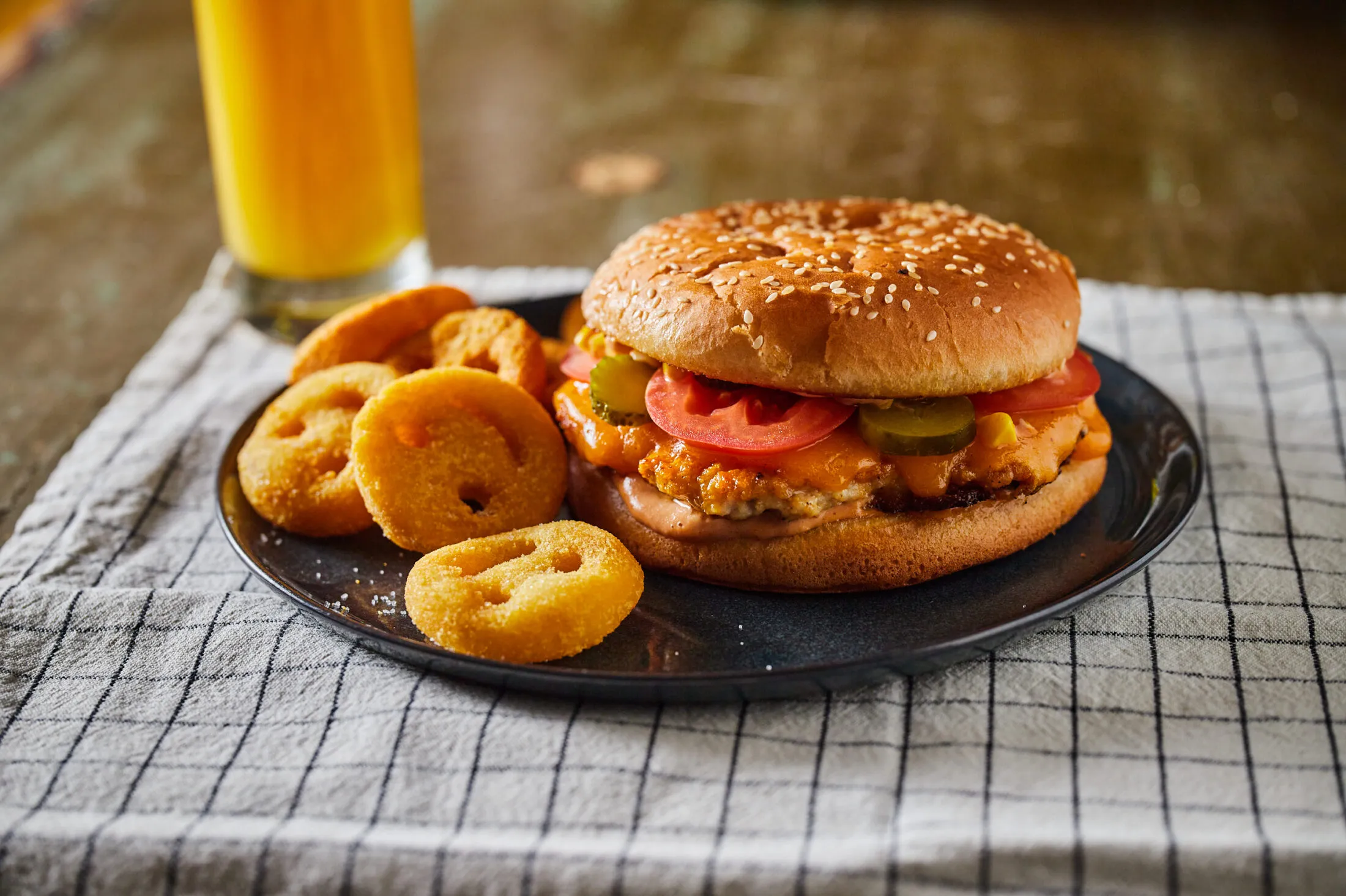 A zsemlék alját megkenjük a szósszal, arra tesszük a húst, majd a húsra helyezzük a karikára vágott paradicsomot és az uborkát. A zsemle tetejét is megkenjük a szósszal, és rátesszük a hamburgerre.