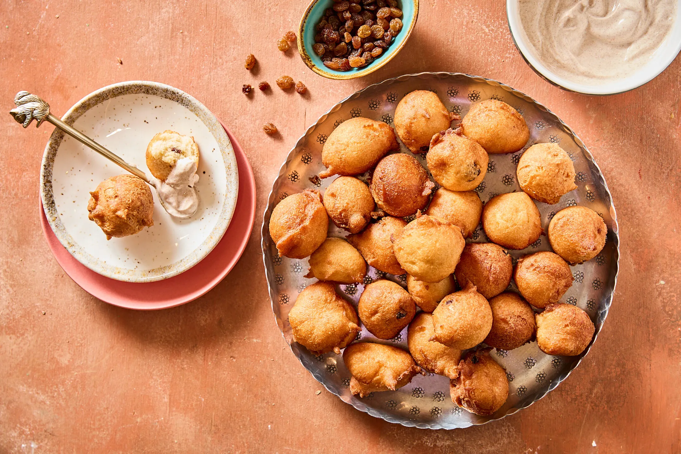A gyümölcsjoghurtos fánk elkészítésének első lépéseként a tojásokat csomómentesre keverjük a joghurttal, a cukorral, a liszttel, a sütőporral, a rummal, a mazsolával és a citromhéjjal. Forró olajba nagyobb diónyi adagokat kanalazunk a masszából, megvárjuk, amíg aranybarnára sülnek, majd lecsepegtetjük a felesleges olajat és papírtörlőre szedjük őket. Még melegen megszórjuk 2 ek porcukorral. A tejfölben elkeverjük a maradék 1 ek porcukrot és a fahéjat, és ezzel a mártogatóssal tálaljuk a megsült fánkokat.