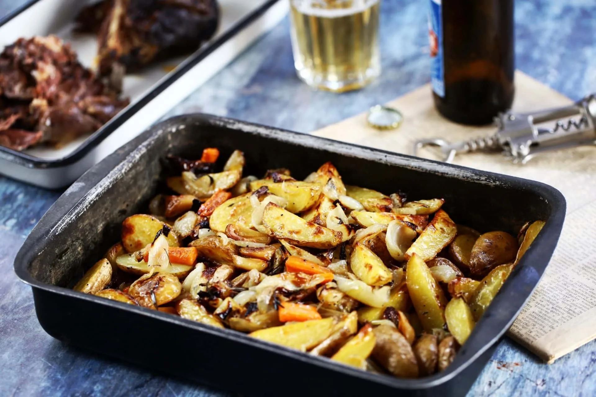 A burgonyákat jól alaposan megmossuk, a sárgarépákat meghámozzuk és a vöröshagymával együtt egységes darabokra vágjuk. Egy nagy sütőpapírral bélelt tepsibe borítjuk a zöldségeket, olívaolajjal, sóval, borssal jó alaposan átkeverjük és mellé dobjuk a friss zöldfűszereket és a fokhagymagerezdeket. 180 fokra előmelegített sütőben 60 percig sütjük.
