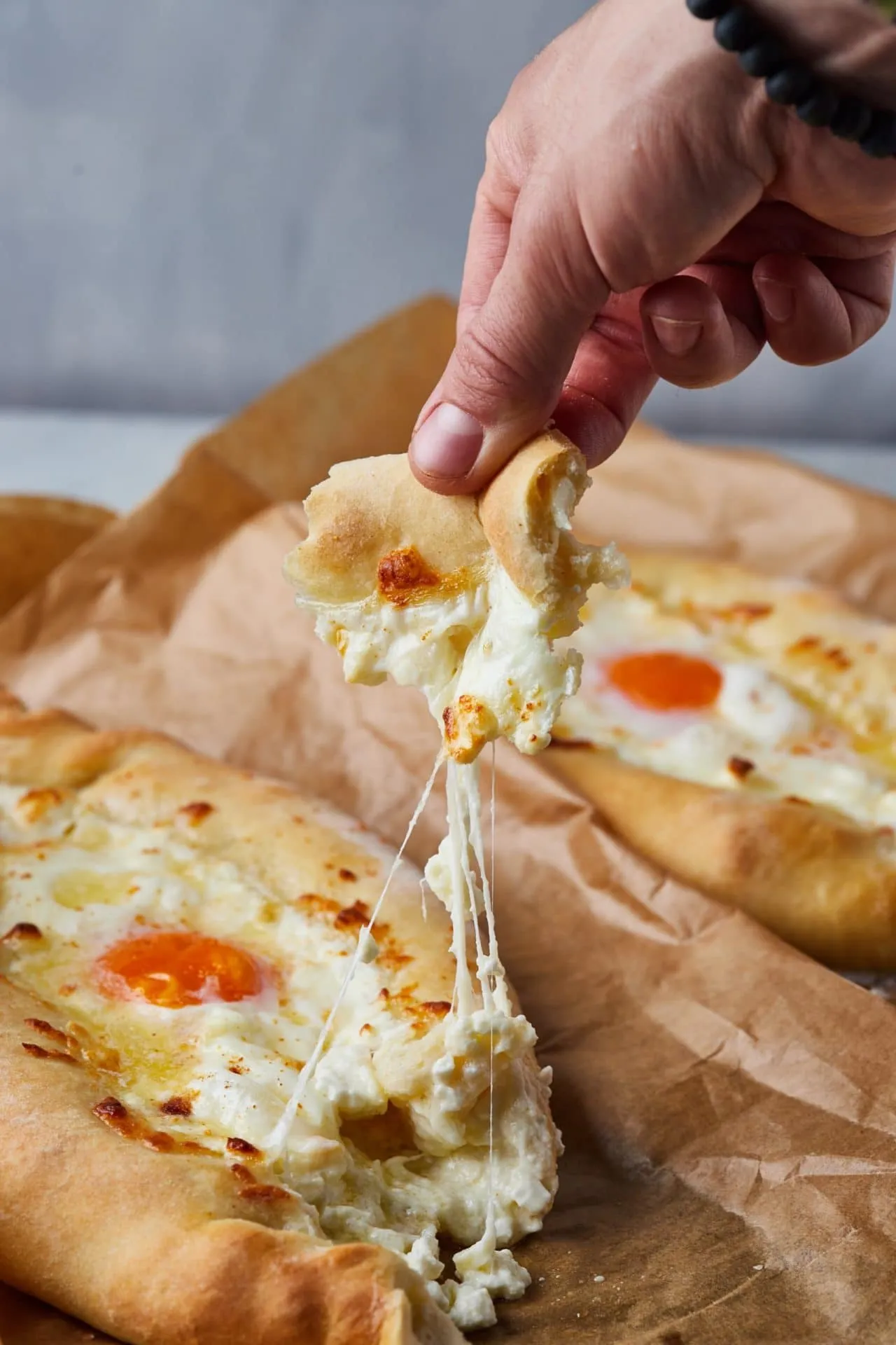 A trappistát, a mozzarellát és a morzsolt fetát összekeverjük. A két cipót 1-1 sütőpapírra tesszük, és kb. 32 cm-es pizza formájúra nyújtjuk, majd képzeletben kettéosztjuk, és a jobb félkörívben és bal oldalt is kb. 2 cm vastagon a szélén, egy csíkban végigrakjuk a sajttal. Ezután elkezdjük ráhajtani a tésztát a sajtra, és lenyomkodva lezárjuk. A végüket megtekergetjük, így egy csónak formát kapunk, aminek a széle meg van töltve sajttal. A maradék sajtot a két kis „csónak” közepére halmozzuk.