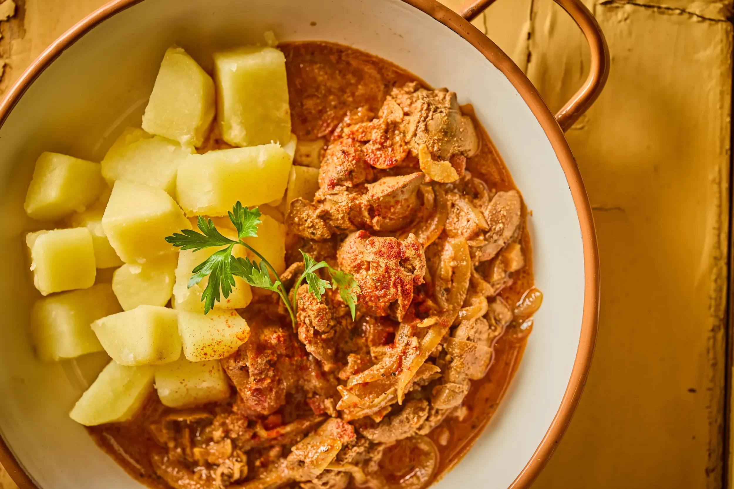 Közben a burgonyát 2-3 cm-es kockákra vágjuk és sós vízben puhára főzzük. Leszűrjük és ezzel tálaljuk a hagymás szaftos májat, aminek a tetejét megszórjuk a sült szalonnával, és egy kis petrezselyemmel és fűszerpaprikával díszítjük.