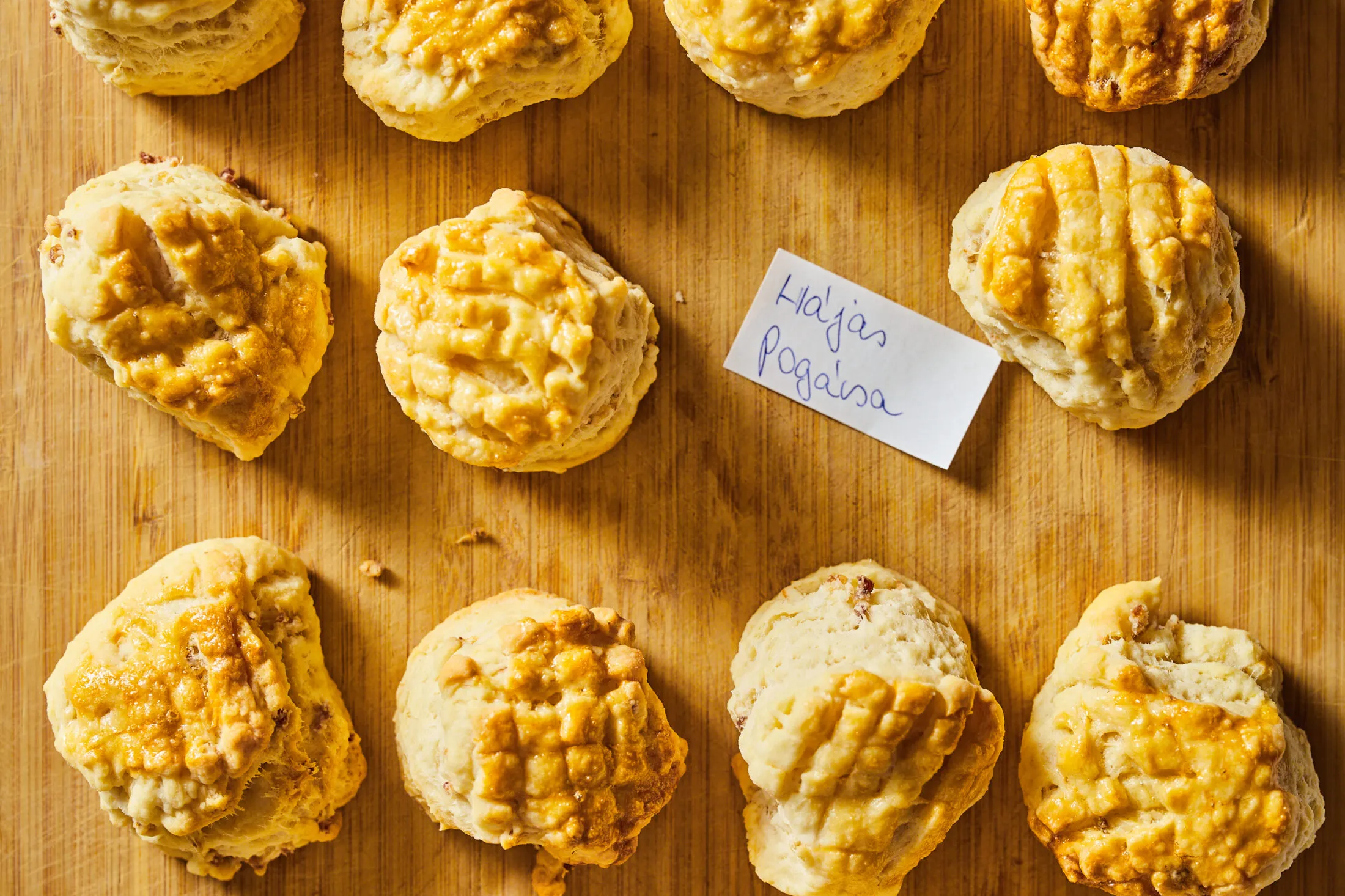 Az utolsó hajtás-pihentetés után kinyújtjuk 2 cm magasságúra, és egy 4 cm átmérőjű pogácsaszaggatóval kiszaggatjuk, majd sütőpapírral bélelt tepsire sorakoztatjuk őket, 0,5 cm-es távolságban keresztben beirdaljuk a tetejét, és lekenjük a felvert tojással. Itt még 10 percet kelesztjük, majd a 190 fokra előmelegített sütőben 20 perc alatt piroskásra sütjük.