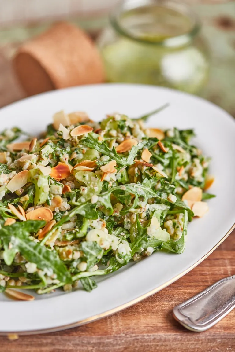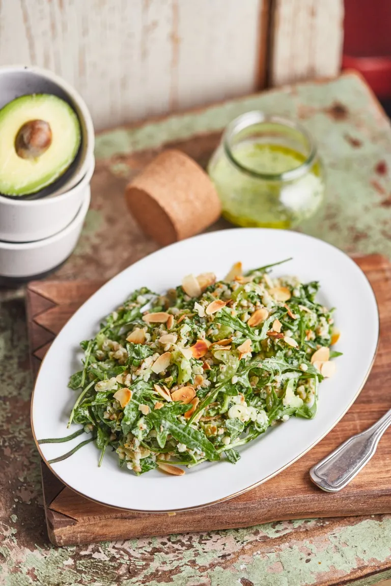 A dresszinghez a zöldfűszereket finomra vágjuk és egy robotgépben az összes többi hozzávalóval együtt alaposan lezúzzuk. Sűrű, zöldes krémet kell, hogy kapjunk. Ráöntjük a hajdinás zöldségekre. Belerakjuk a pirított mandula felét és összekeverjük az egészet. A maradék mandulával megszórva tálaljuk.