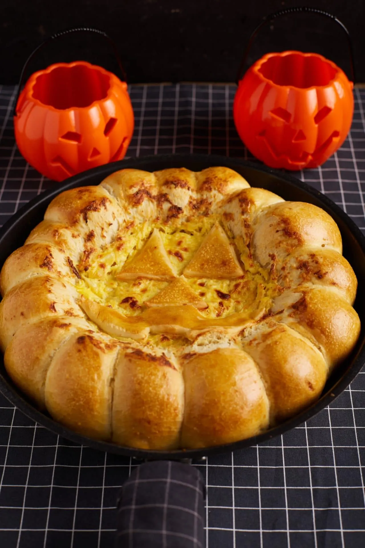 Ha megkelt a tészta, és a mártogatós is kész, a tésztát egy enyhén lisztezett deszkára borítjuk, majd félretesszük az ¼ részét, a nagyobb részt pedig szép gombóccá gyúrjuk. Kb. 16-18 darab egyenlő gombócot formázunk belőle, és belerakjuk egy olyan serpenyőbe, amit a sütőben is tudunk sütni, egymás mellé, a széléhez. Letakarjuk, és 15 percet állni hagyjuk.
