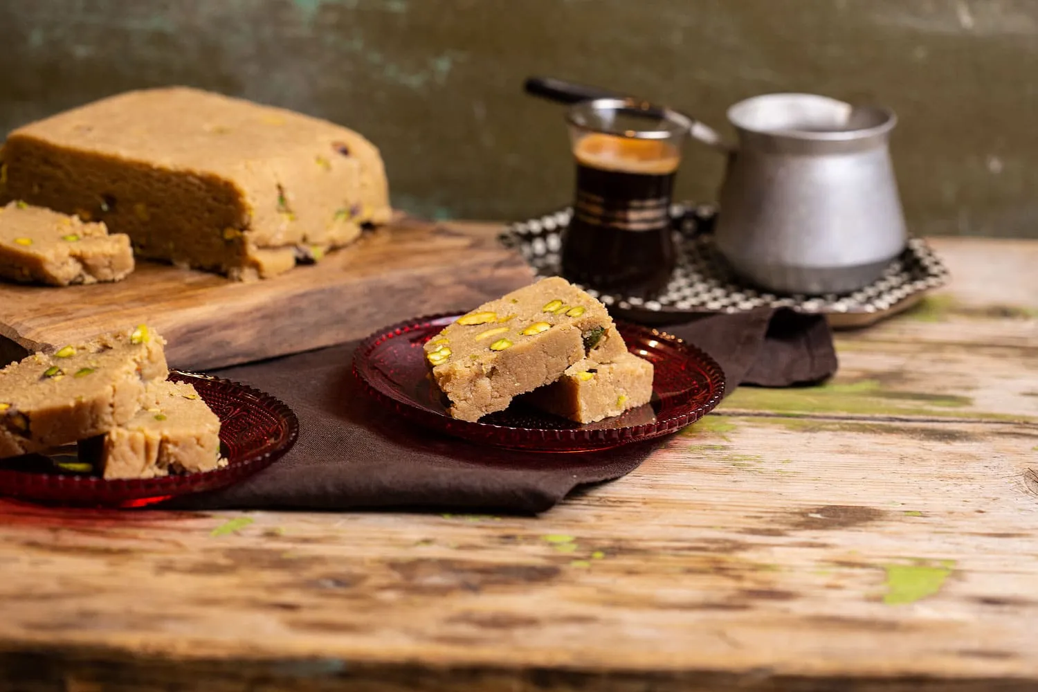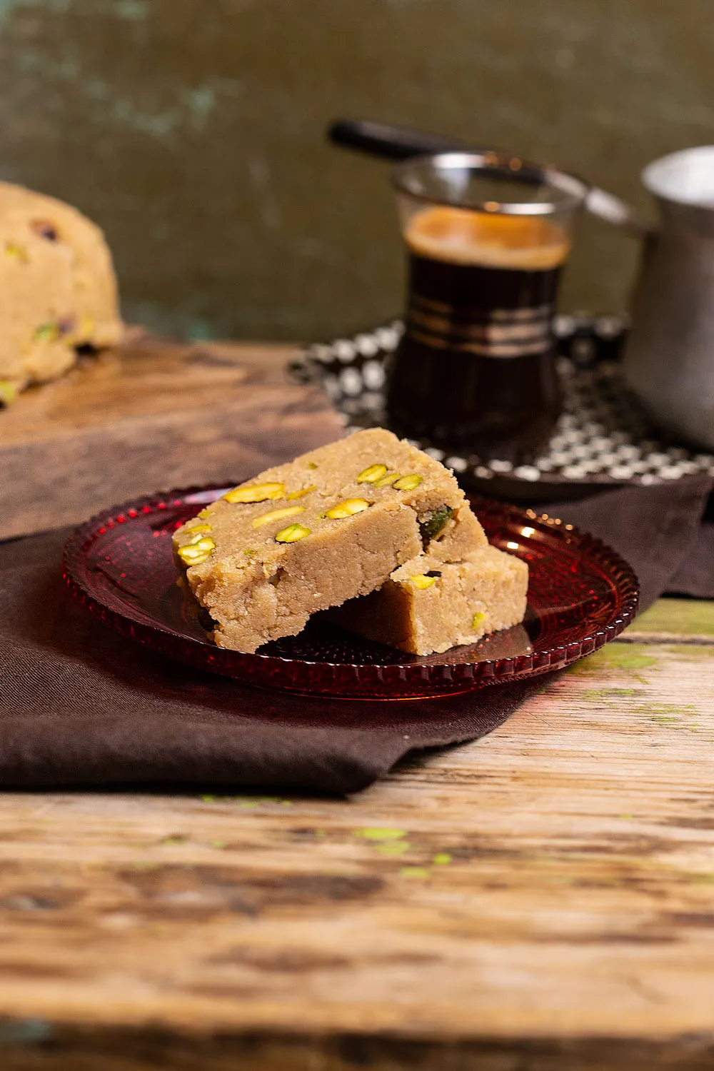 Egy nagy tálba rakjuk a szezámmagpasztát, hozzáadjuk a fahéjat, a kardamomot, a lime-levet és a rózsavizet, majd elkezdjük keverni. Vékony sugárban belecsorgatjuk a cukorszirupot, és kb. 10 percig keverjük, hogy szépen összeálljon a halva alapja. Ekkor belekeverjük a pisztáciát is, majd egy kb. 20 x 15 cm-es, sütőpapírral bélelt, magasabb falú sütőtálba simítjuk a masszát, és 2-3 órára a hűtőbe rakjuk.
