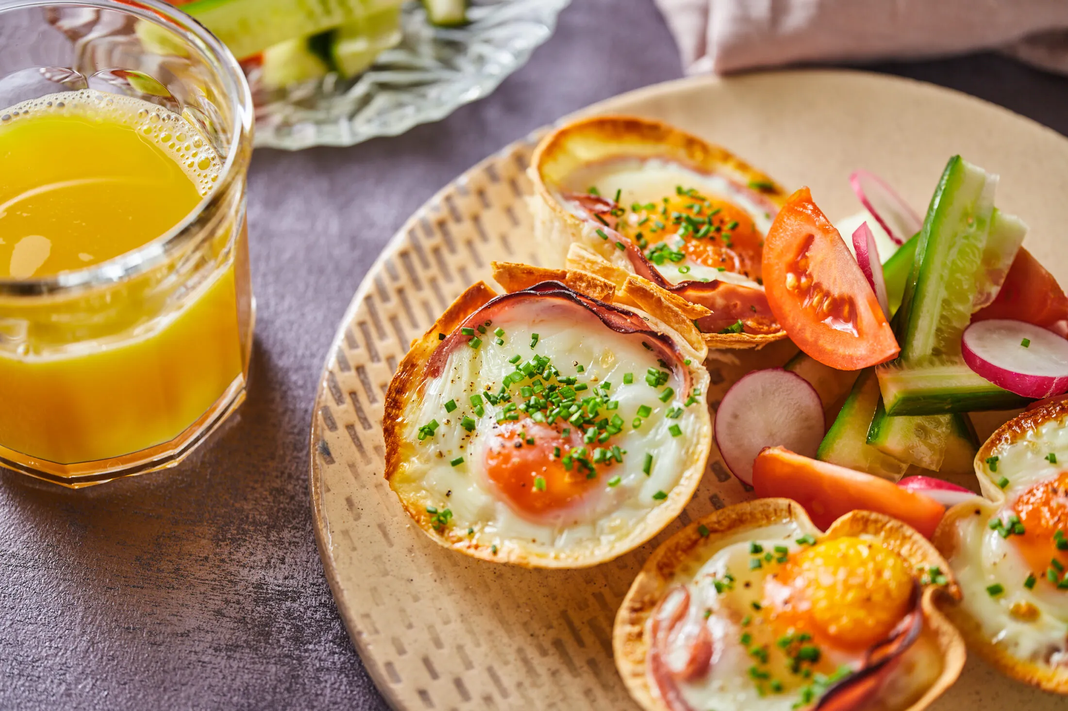 A ham and eggs tortillakosár elkészítésének első lépéseként a tortilla lapokból egy 12 cm-es pogácsaszaggatóval kiszúrunk 8 db-ot. Ezeket a korongokat belenyomjuk a muffin sütőforma mélyedéseibe. Belehajtjuk a sonkákat, beleütünk mindegyikbe 1 db tojást, sózzuk, borsozzuk, és betesszük sülni a 180 fokra melegített sütőbe 15-20 percre. Ha megsültek a tojások, kiemeljük a formából őket, megszórjuk finomra vágott snidlinggel és a szeletelt zöldségekkel tálaljuk.