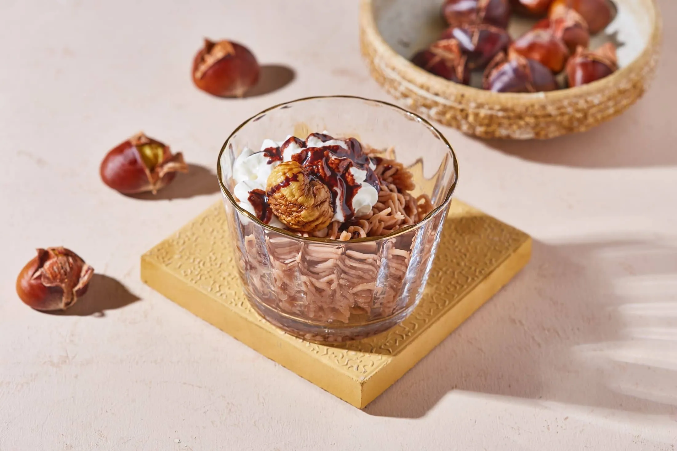 Ezután a gesztenyéről leöntjük a vizet, és 200 fokra előmelegített sütőbe tesszük 20 percre. Még melegen meghámozzuk, és egy turmixgépbe tesszük a rummal, a cukorral és a vaníliás cukorral. Vízforralóban vizet forralunk, és felöntjük a gesztenyét körülbelül a feléig forró vízzel. Legalább 4-5 percig turmixoljuk, majd, ha darabos maradt, egy szűrőn átpasszírozzuk.