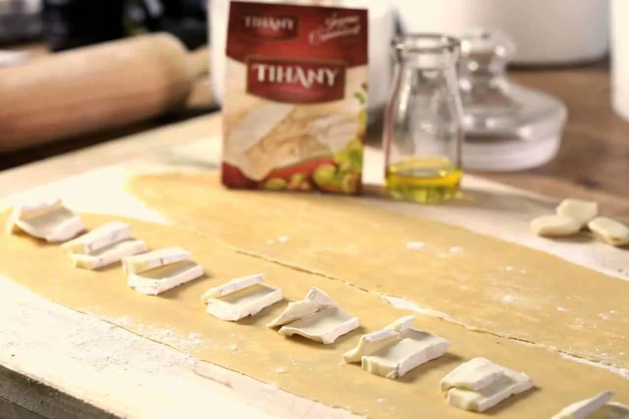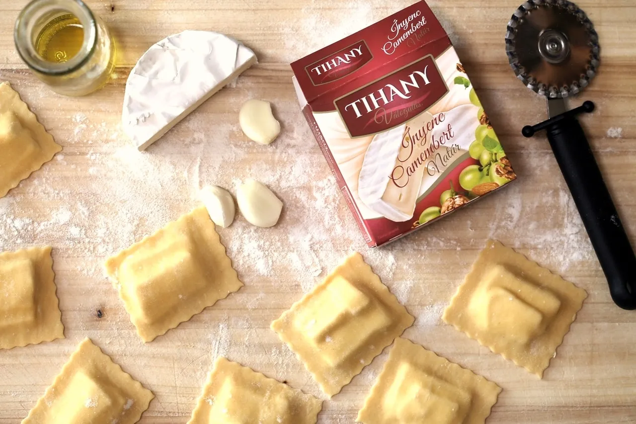 A házi ravioli tésztájához a hozzávalókat jól összegyúrjuk, hogy szép homogén legyen. Ha van tésztanyújtó gépünk azzal, ha nincs, akkor lisztezett deszkán nyújtófával kinyújtjuk a tésztát két részletben, vékony hosszúkás alakúra. A camembert sajtot felszeleteljük és az egyik kinyújtott tésztalapra rakosgatjuk őket kb. 2 cm-re egymástól, befedjük őket a másik lappal, jól lenyomkodjuk és derelyevágóval körbevágjuk őket. Enyhén sós, forró vízben pár perc alatt kifőzzük őket.