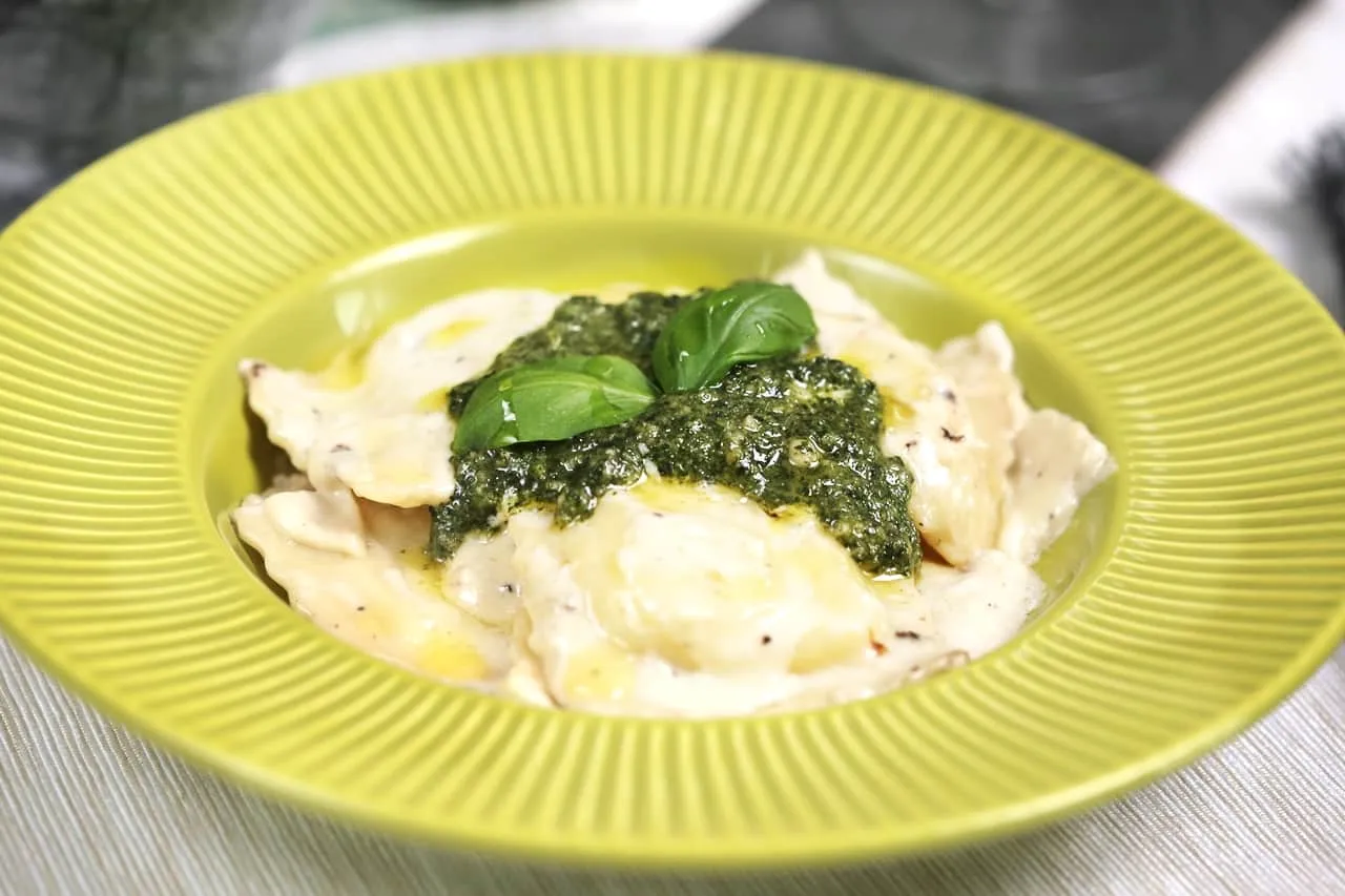 A szószhoz az olajon kicsit lepirítjuk az apróra vágott fokhagymát, sózzuk, borsozzuk, ráreszelünk kevés szerecsendiót és felöntjük a tejszínnel és a fehérborral. Pár perc alatt beforraljuk a mártást, hogy kicsit sűrűbb, krémesebb legyen és beleforgatjuk a raviolikat. Egy aprítógépbe pakoljuk a pesto hozzávalóit és lezúzzuk őket. A házi pestóval tálaljuk a raviolikat.