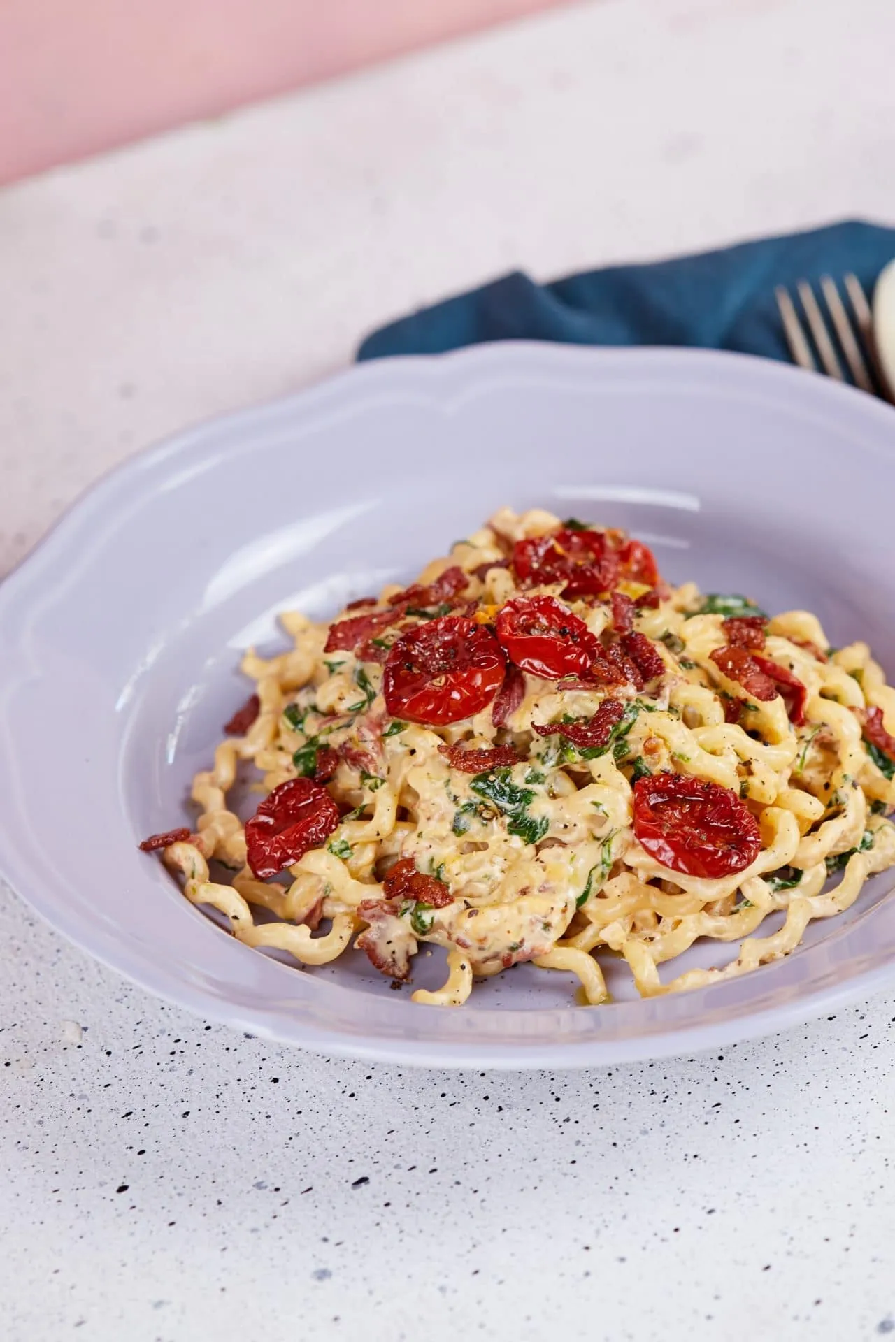 Ha tésztához szeretnénk felhasználni, az összmennyiség negyede kell 2 főre. Egy serpenyőben zsírjára pirítjuk az apróra vágott bacont, kiszedjük, és a visszamaradt zsiradékon megpirítjuk az apróra vágott hagymát és fokhagymát. Rádobjuk a spenótot, és ha összeesett sózzuk, borsozzuk, felöntjük a tejszínnel, jöhet bele a bacon és a szárított paradicsom, belereszeljük a parmezánt, kicsit megvárjuk, hogy besűrűsödjön, ezután mehet bele a citrom héja és leve. A tésztát sós vízben al dentére főzzük, 100 ml főzővizet tartsunk meg, ha túl sűrű lenne a ragu. Hozzákeverjük a tésztát, és kész is.