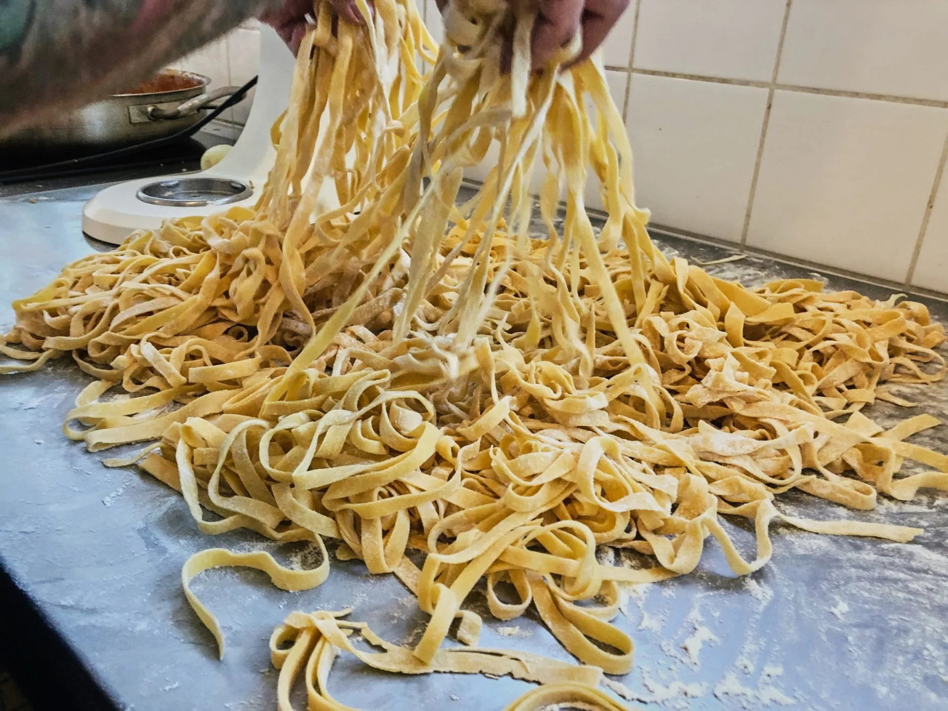 A tésztához az alapanyagokat nagyon alaposan összegyúrjuk, amíg homogén állagú nem lesz. Ha túl keménynek találjuk, egy kevés vízzel lazíthatjuk, ha túl puhának, akkor pedig egy kevés lisztet tehetünk hozzá (attól függ, mekkorák a tojások és mennyi a nedvességtartalmuk). Fóliába tekerjük és minimum fél órát pihentetjük a hűtőben. Ezután egy tésztagép segítségével 1-2 mm vastagságúra nyújtjuk, majd egy késsel tagliatelle formára vágjuk.