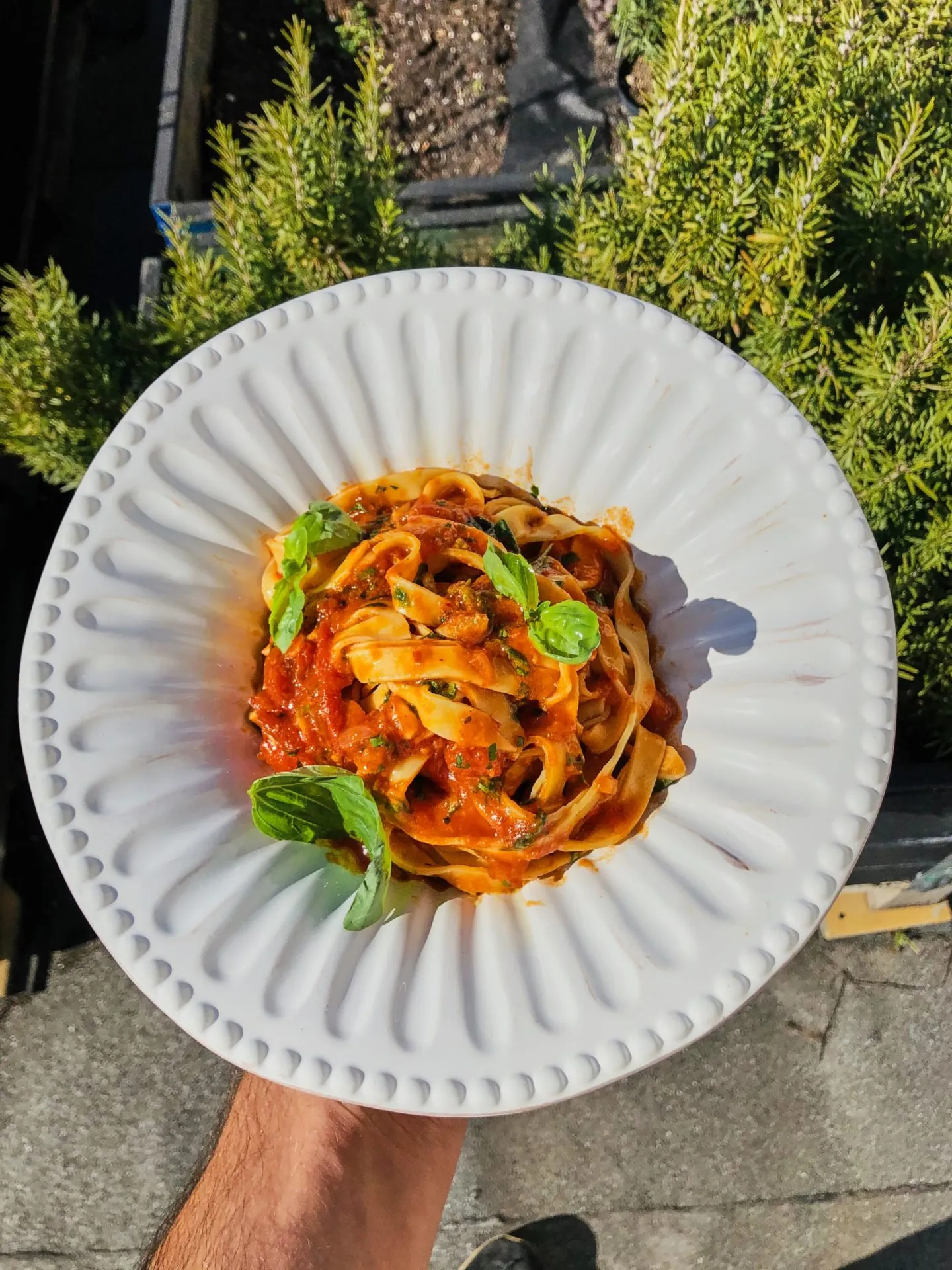 A tésztát erősen sós, forrásban lévő vízben 3-5 perc alatt megfőzzük, leszűrjük, a szószba keverjük, és megszórjuk az aprított bazsalikommal és petrezselyemmel. Tálalásnál teszünk a tésztára friss bazsalikomlevelet és meglocsoljuk olívaolajjal.