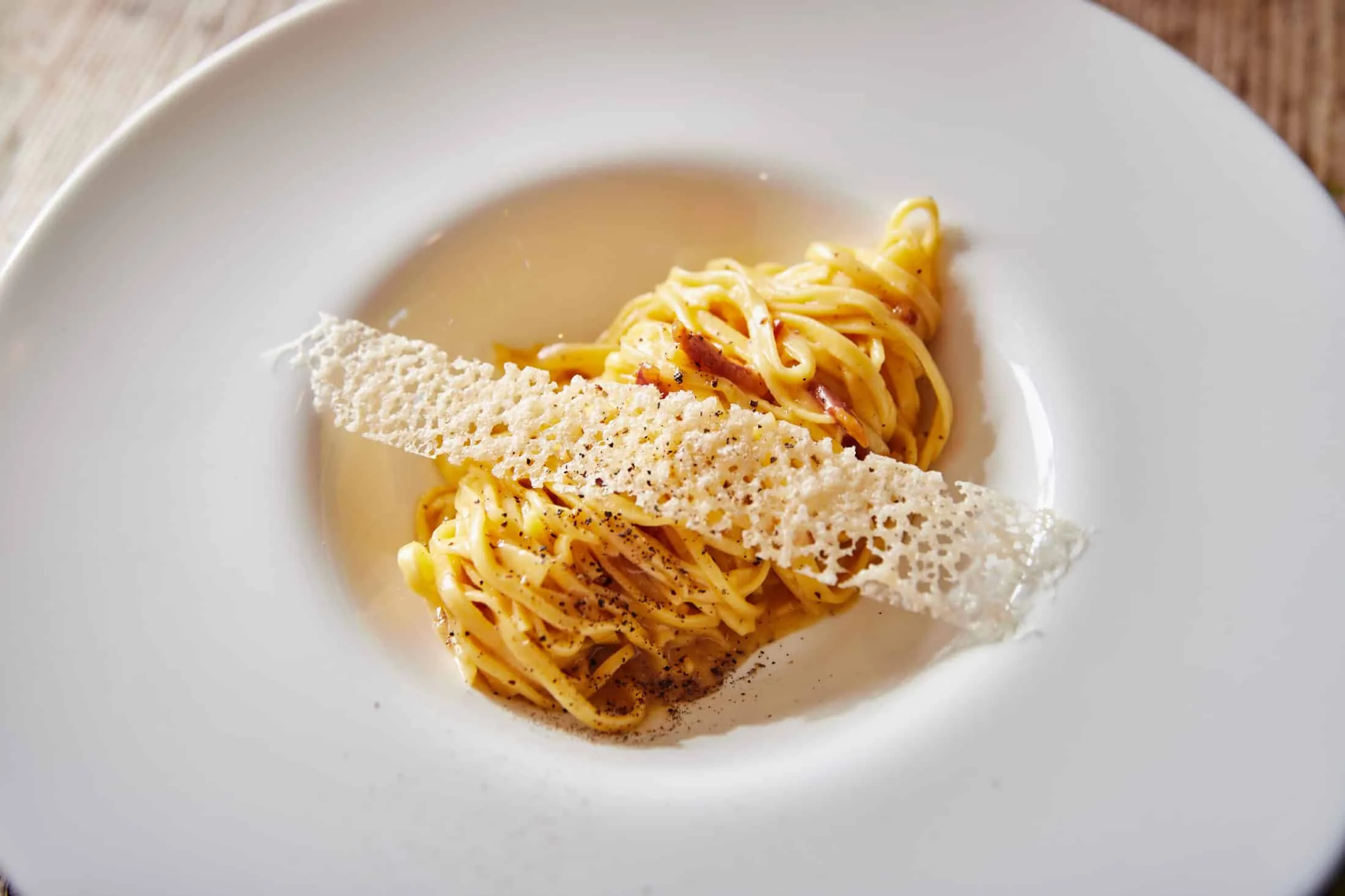 Ha kész vagyunk a mártással és a szalonna is megpirult, kifőzzük a tészta felét. Mivel friss a tésztánk, ezért lobogó, sós vízben kb. 1 perc elegendő. Félreteszünk egy kevés főzővizet, majd a kifőtt tésztát leszűrjük, és beleszedjük a szalonna visszamaradt zsírjába. Adunk hozzá 1-2 merőkanál főzővizet, és közepes lángon emulgeáljuk a szalonnazsírral. Félrehúzzuk, várunk 1 percet, hogy ne legyen tűzforró, majd belekeverjük a tojásos keveréket és a pirított szalonnát. Frissen őrölt borssal és a parmezánchipsszel tálaljuk.