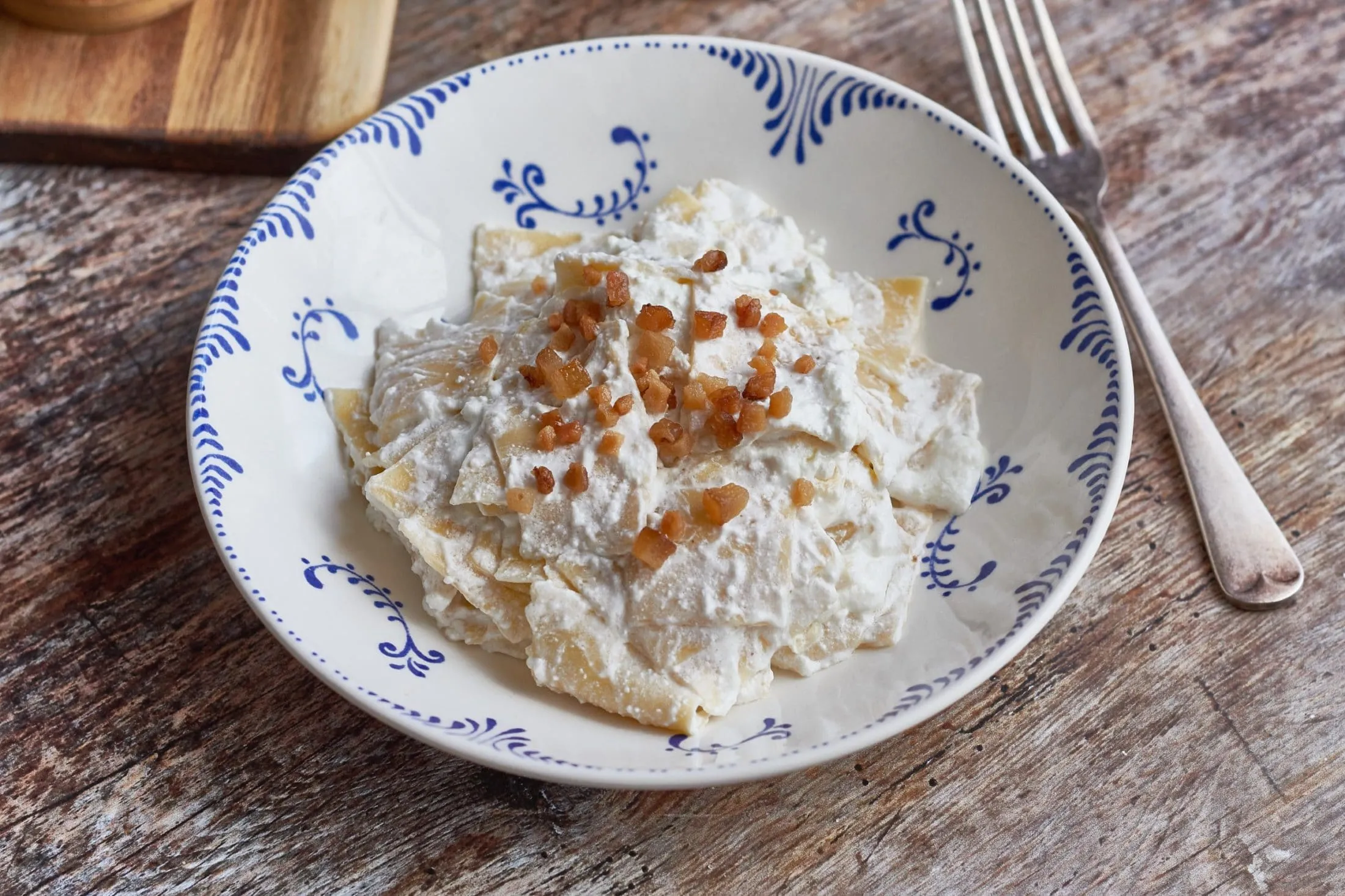 A feltéthez a szalonnát kis kockákra vágjuk, zsírjára sütjük, majd félrerakjuk a szalonnát. A zsírt összekeverjük a túróval és a tejföllel, és ha igényli, kevés sóval, majd beleforgatjuk a tésztát. Tálaláskor megszórjuk a szalonnával.