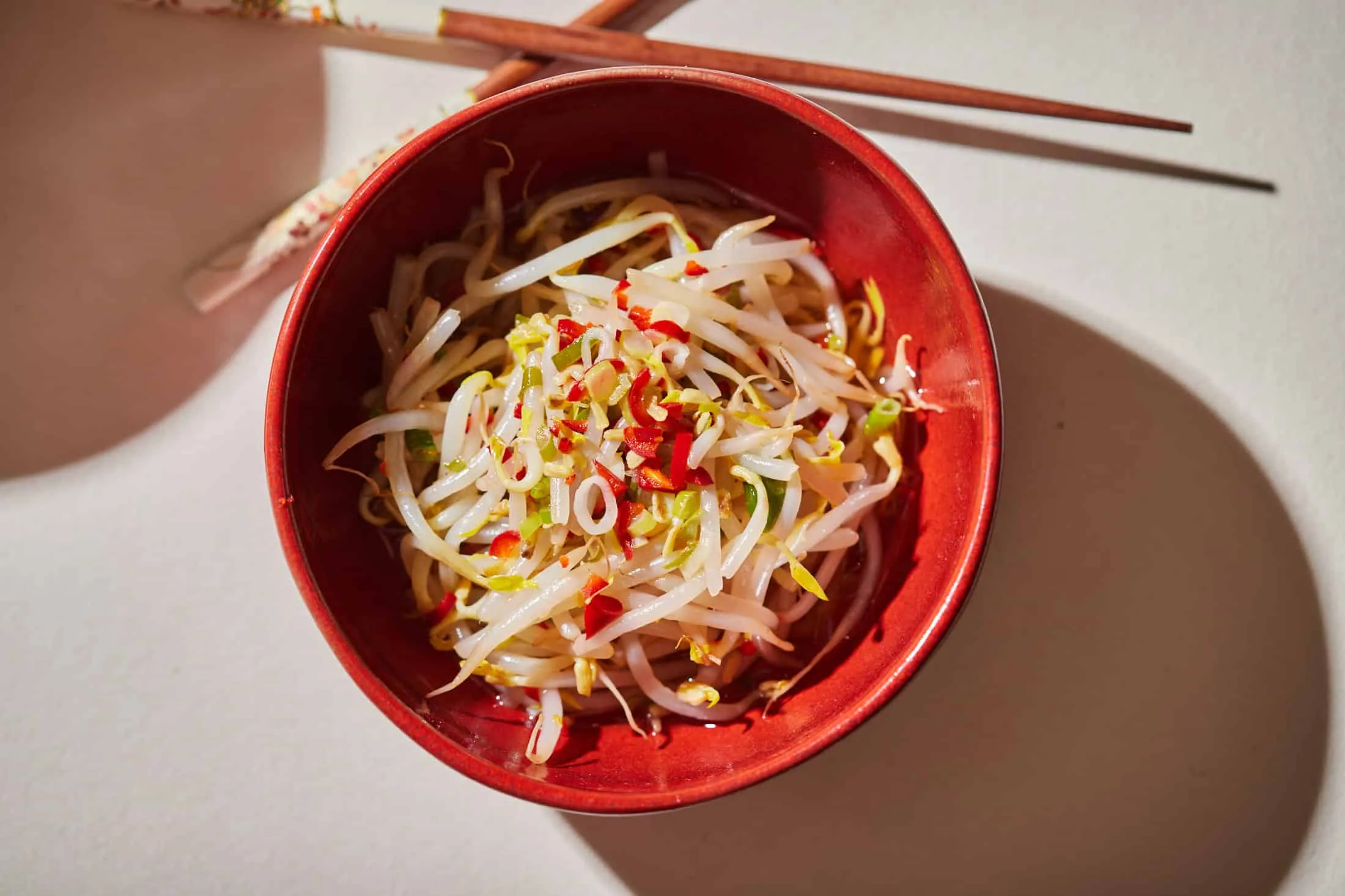 Az így kapott forró olajat egy szűrőn keresztül ráöntjük az apróra vágott újhagymára és chilire, hozzáadjuk az ecetet, a cukrot és a sót, majd jól összekeverjük. A babcsírát lecsepegtetjük, egy keverőtálba tesszük, és ráöntjük az olajos szószt, alaposan összeforgatjuk, és tálalhatjuk is.