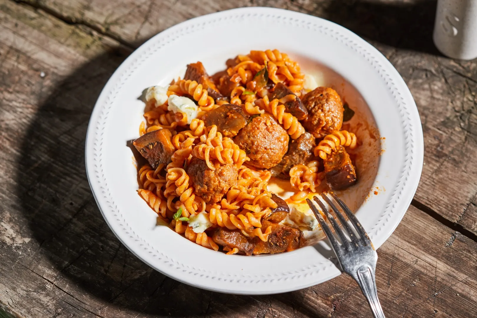 Húsgombócos gorgonzolás sült padlizsános fusilli