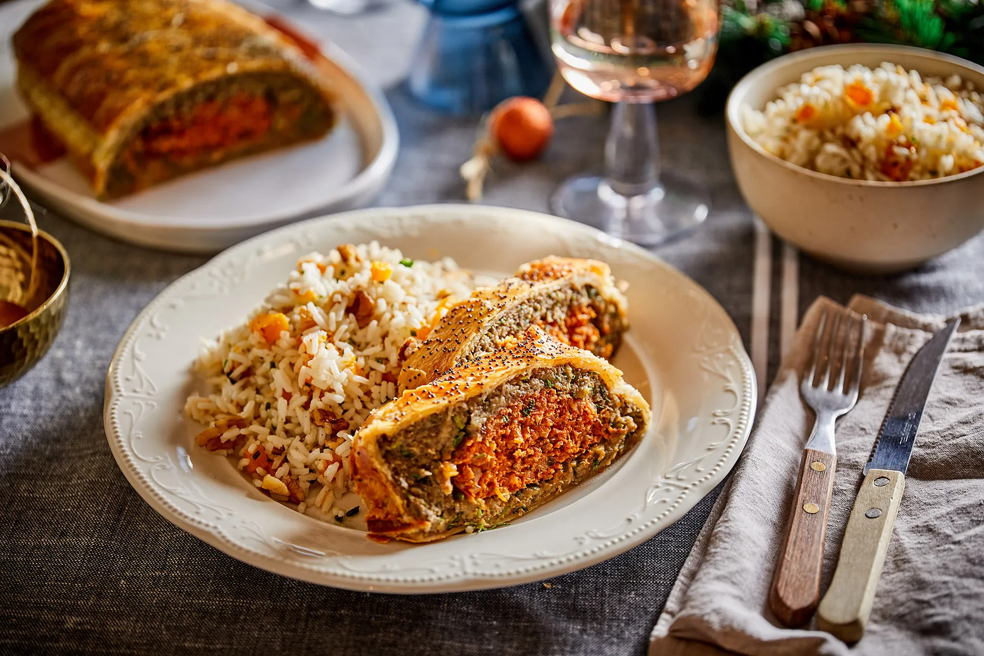 A Wellingtonból kb. 3 cm-es szeleteket vágunk, és a sütőtökös rizzsel tálaljuk.